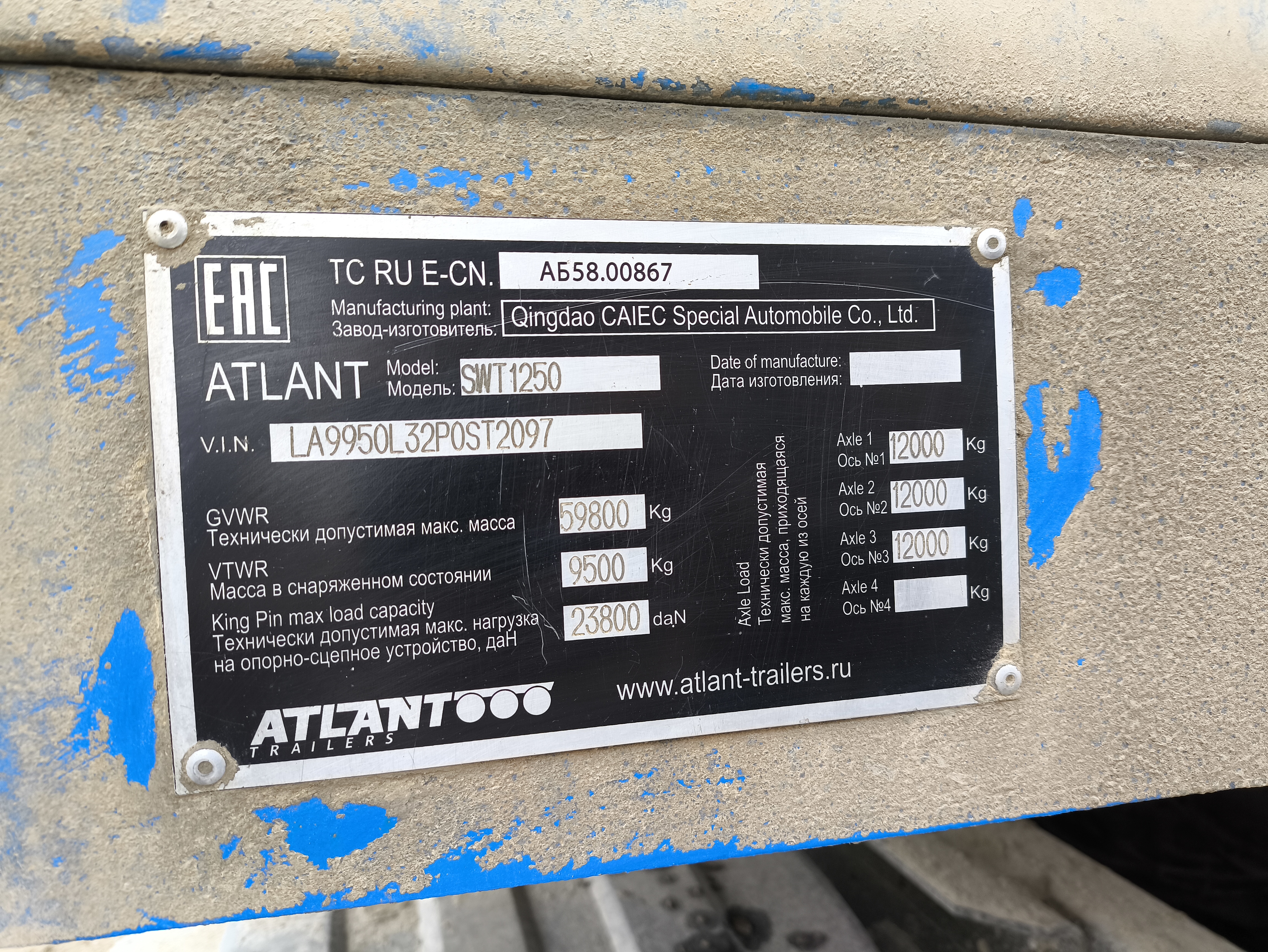 Номер лота: 000011379 Ответственный сотрудник отдела реализации изъятого имущества: Гапиенко Константин Леонидович «Доступно ЗА НАЛИЧНЫЕ или В ЛИЗИНГ» Модель: ATLANT SWT1250 Тип: специализированный полуприцеп-контейнеровоз Год выпуска: 2023, новый Грузоподъемность: 50’300 кг (+/-1%) Максимально разрешенная масса: 59’800 кг Макс. допустимая нагрузка на сцепное устр-во: 23’800 кг Макс паспортная осевая нагрузка: 3×12’000 кг Размер платформы: 12’390×2’450 мм Фитинги: 12шт для ISO контейнеров 1×20`,2×20`,1×40’ Коники: вставные высота 1’500 мм 4 пары Борта: 5секционные 800мм, стальные, легкосъемные Сцепной шкворень: 2 дюйма Высота шкворня от уровня земли: 1’450 мм Опорное устройство: JOST A400 80/25т Оси марка: BPW HZM 13010, макс. нагрузка 3×13тонн Подвеска: рессорная зависимая на продольных полуэллиптических рессорах, с качающимися балансирами, с реактивными штангами Тормозная система: пневматическая WABCO 2S/2M, ABS Тормозные механизмы: барабанные BPW Шины: 12R20 TRIANGLE TR668 (12+1), двускатная ошиновка Электрооборудование: 2-х проводное 24V Светотехника: HELLA