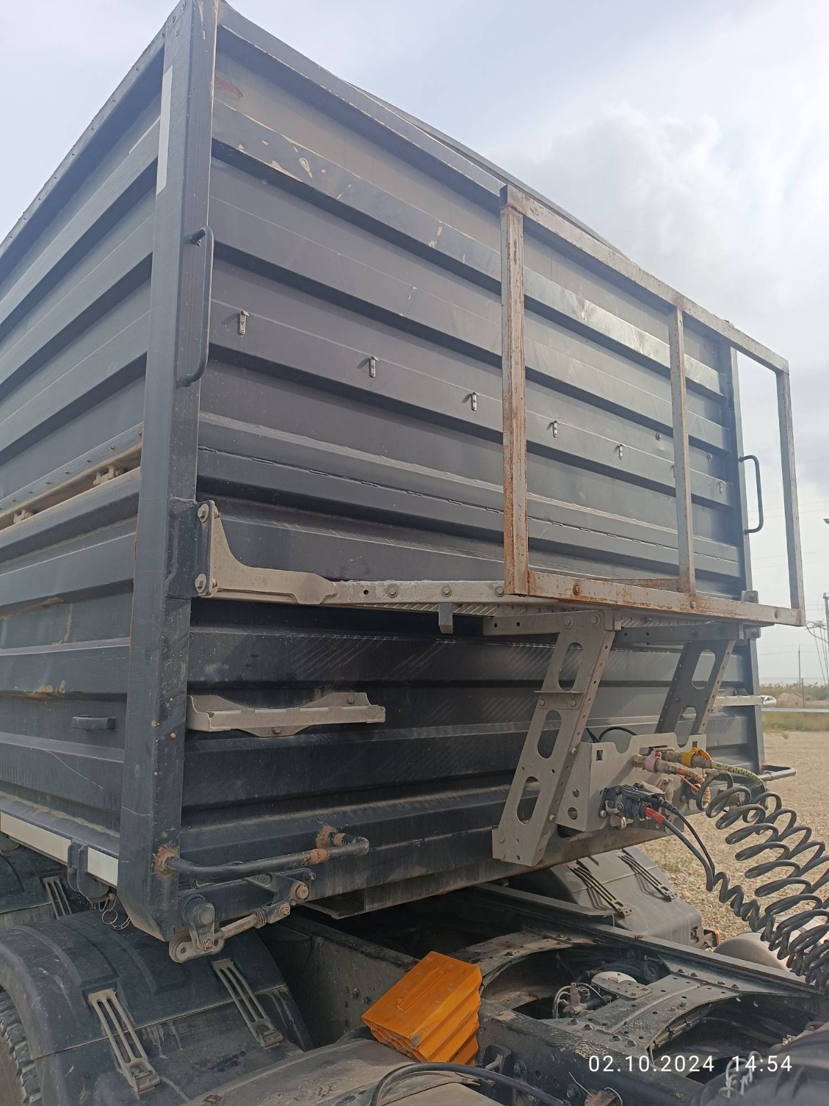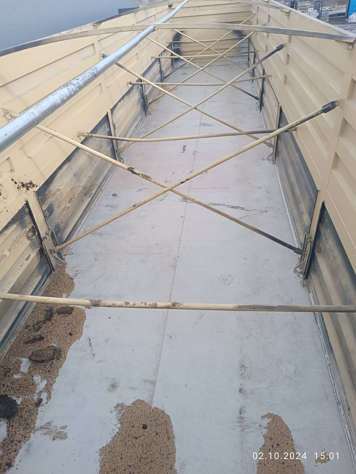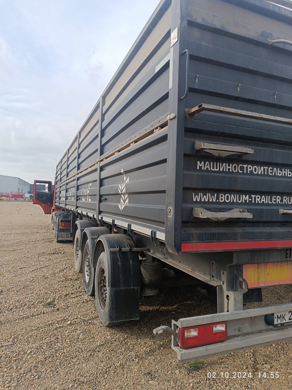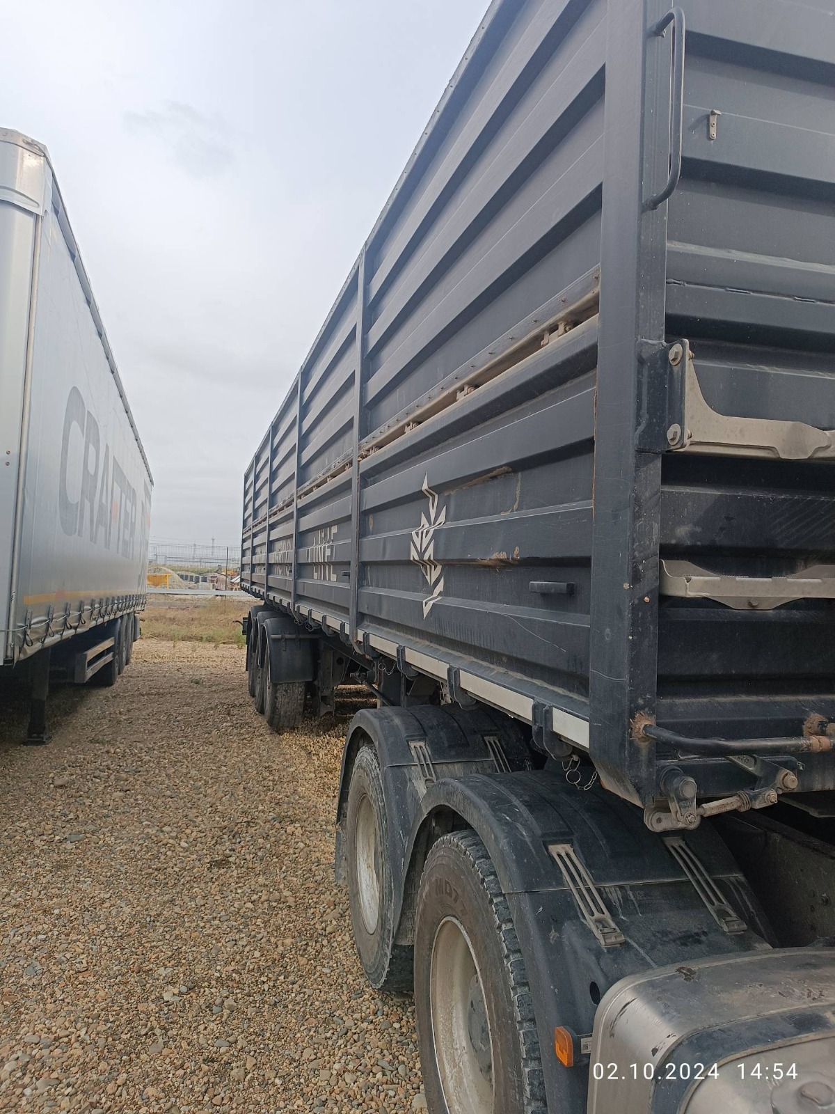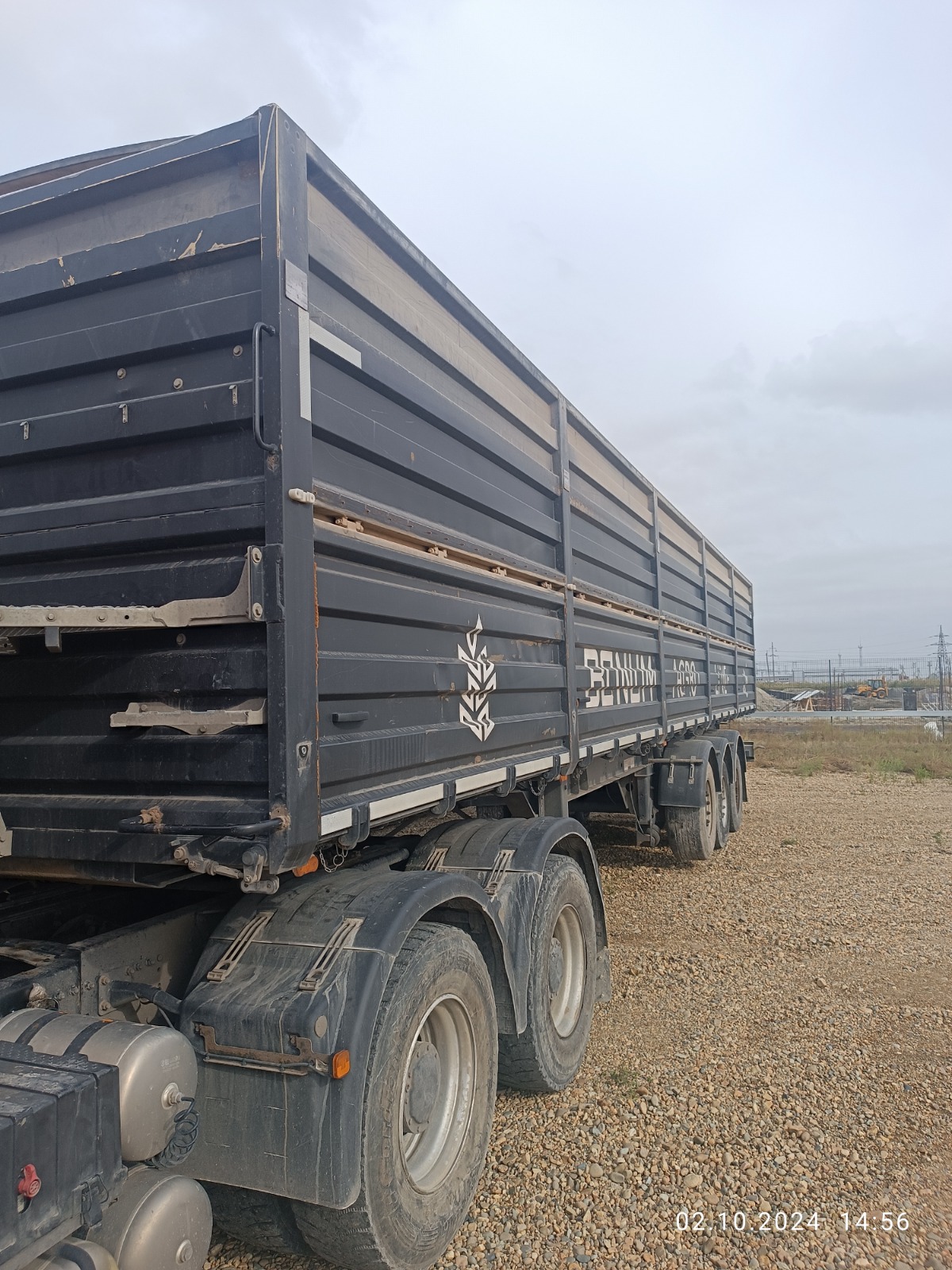 ОРИЕНТИРОВОЧНЫЕ РАЗМЕРЫ, МАССА И ОБЪЕМ ПОЛУПРИЦЕПА: НАЗНАЧЕНИЕ — транспортировка сельскохозяйственных культур плотностью от 0,25 до 0,85 м3 и палетных грузов. Длина габаритная, L мм 13 100 Ширина габаритная, мм 2 550 Высота габаритная, H2, мм 3 440 Внутренняя ширина кузова, мм 2 440 Внутренняя высота кузова H3, мм 1 900 Внутренняя длина кузова, мм 12 500 Внутренний объём кузова м3 58 Грузоподъёмность полуприцепа кг до 30 000 Максимальная полная масса автопоезда (кг) 44 000 Снаряженная масса полуприцепа (кг) 6 900 Межосевое расстояние (мм) 1 310 Высота CCУ, минимальная H1, мм 1 150 Нагрузка на ССУ допустимая (кг) 11 000 КОНСТРУКЦИЯ ПОЛУПРИЦЕПА: • сварная рама усиленной конструкции из двух лонжеронов двутаврового сечения, соединённых поперечными балками;• опорное устройство двухскоростное с ручным односторонним приводом; • шкворень диаметром 2” JOST (Германия) международного типа с опорной плитой;• съёмная корзина запасного колеса Takler (Италия); • две буксировочные петли в задней части рамы; • заднее защитное устройство; • оцинкованные кронштейны навесного оборудования; КУЗОВ: • кузов объемом 58м3 с выгрузкой на левую и правую стороны; • откидные боковые борта с верхней навеской; • толщина профиля борта – 1,5 мм (борт «BONUM») • запорная фурнитура бортов Suer (Германия)/ Hildebrand (Германия) / Rapid (Германия);• каждый борт открывается отдельно и фиксируется в открытом положении;• резиновая полоса в верхней части откидных бортов (для защиты петель навески от атмосферных осадков);• ступеньки на задней стенке кузова для обслуживания полога; • ступеньки на передней стенке внутри кузова для доступа внутрь; • жёсткие стяжки внутри кузова, для сохранения геометрии кузова; • резиновые уплотнители по внутреннему периметру бортов для предотвращения просыпания груза; ПОДВЕСКА И ШИНЫ: • оси SAF (Германия) 3 х 9000 кг; • тормозные механизмы дискового типа. • шины бескамерные Goodyear/Pirelli/ Cordiant или аналог (на усмотр. производителя) размерности 385/65 R22,5 с диском - 6 + 1 шт.; ТОРМОЗНАЯ СИСТЕМА: • пневматическая двухконтурная тормозная система Wabco (Германия); Тормозная система с ABS ЭЛЕКТРООБОРУДОВАНИЕ: • электрооборудование Aspoeck (Австрия) / Hella (Германия) / Ermax (Германия) или аналог;: • индивидуальные крылья с кронштейнами Domar (Италия)/Parlock (Финляндия)/Lago (Италия) – 6шт;• брызговики задних колес Domar (Италия) – 2шт.; • бак для воды Lokhen (Италия)/Lago (Италия) с краном и дозатором под жидкое мыло – 1 шт.;• инструментальный ящик Daken(Италия)/Parlock (Финляндия)/Lago (Италия) с механизмом запирания на ключ – 1 шт.• два противооткатных упора Lokhen (Италия)/Parlock (Финляндия)/Lago (Италия);• контурная светоотражающая маркировка лентой премиального качества 3M (США) /BICMA (Италия);• противоподкатная защита Takler (Италия); ПОЛОГ И СИСТЕМА КРЕПЛЕНИЯ: • полог из ПВХ плотностью 630-680 гр./м2 ( цвет по согласованию) ; • направление разматывания тента – на правую сторону (на левую сторону - опция);• свес полога с кажд