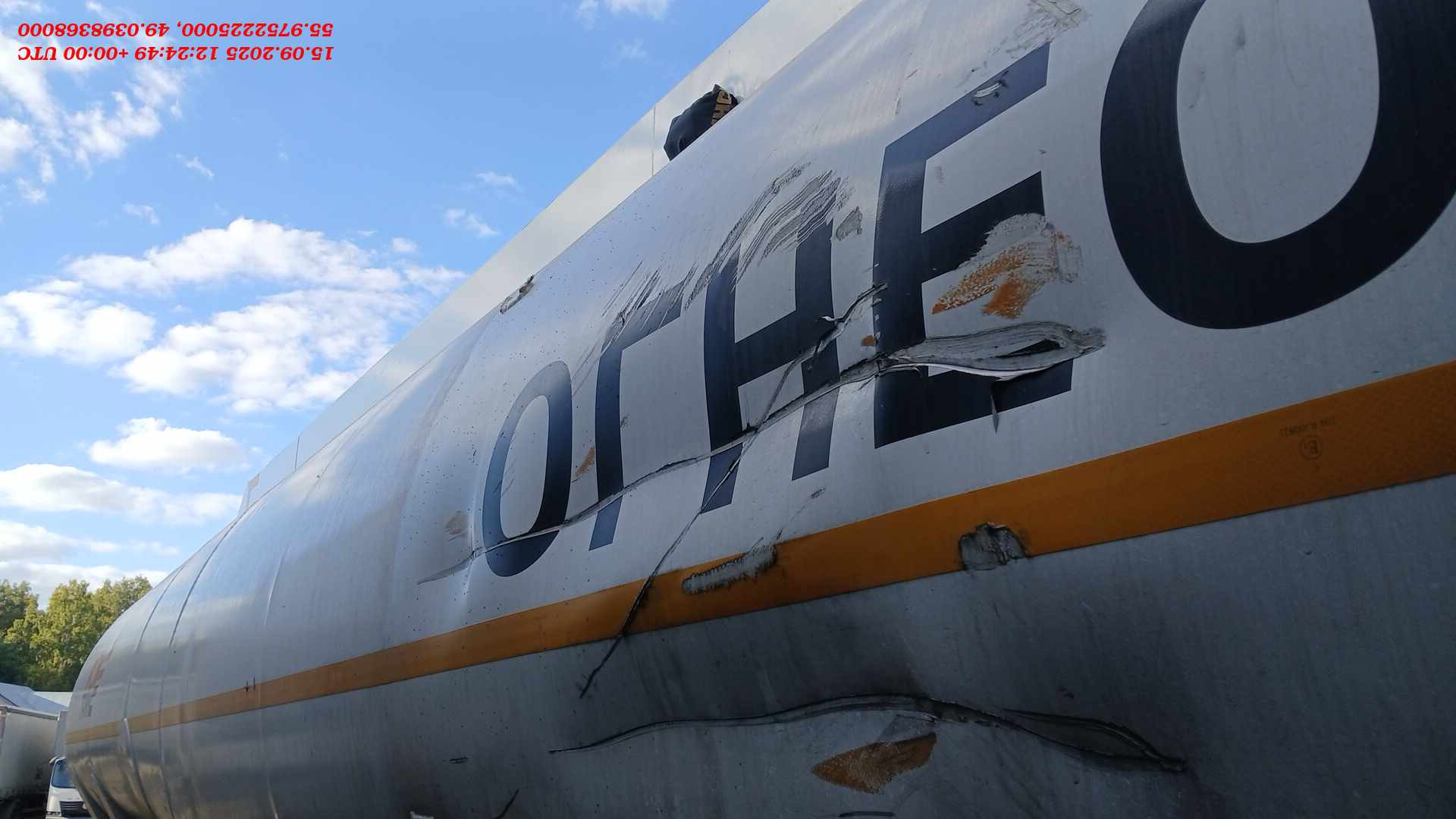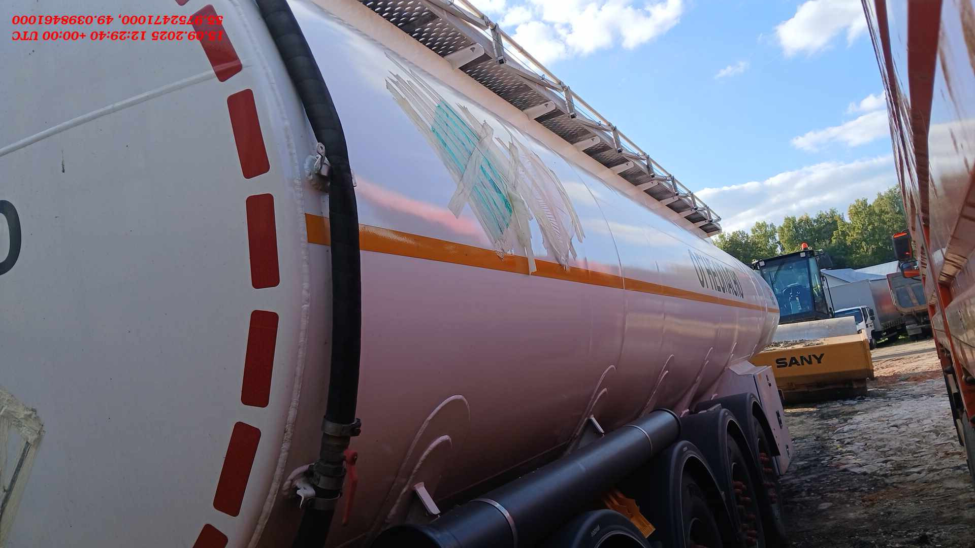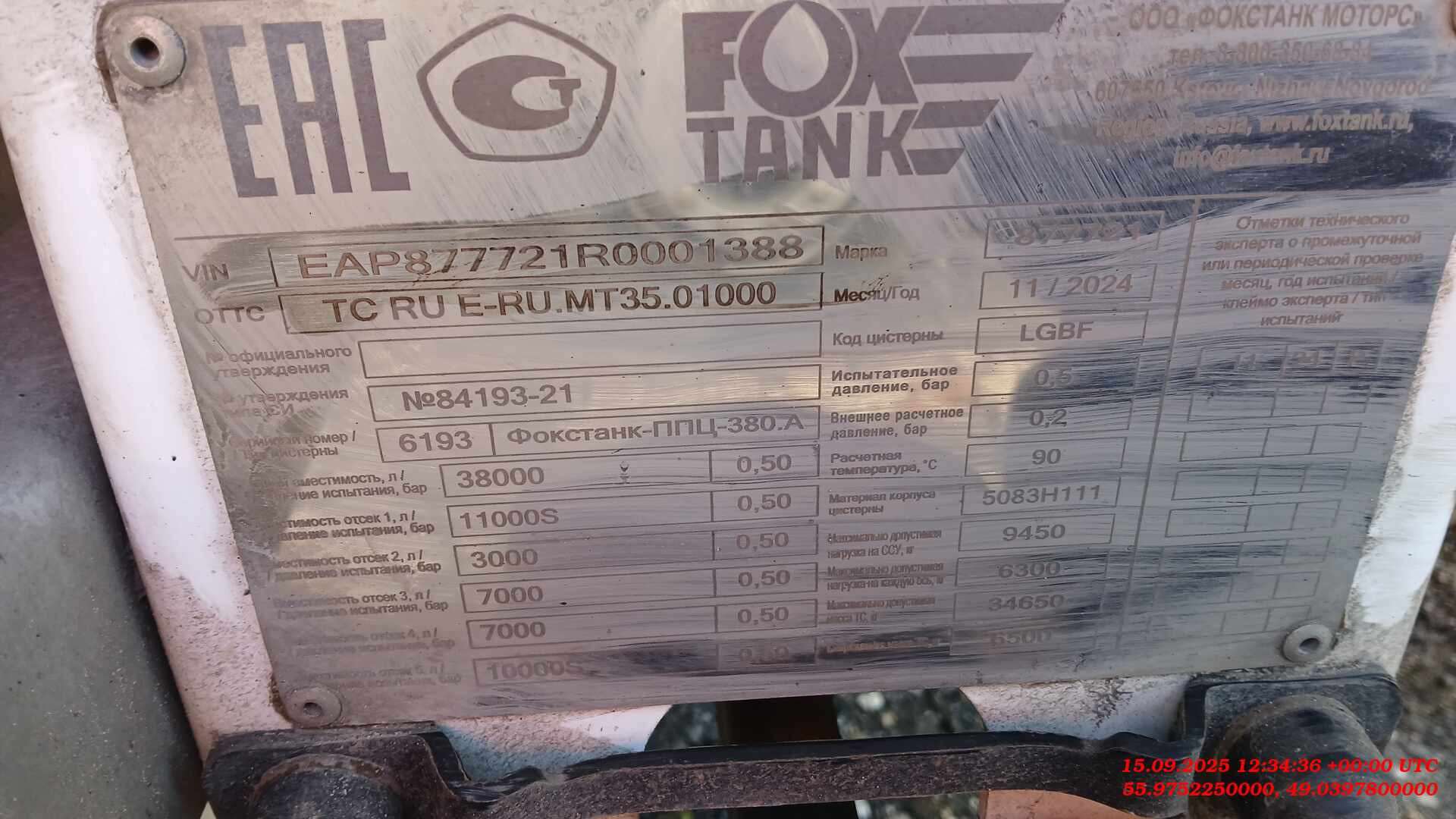 Ответственный за реализацию: Михеев Максим Номер лота: 000014160 Основные технические характеристики: Количество осей: 4 Объём цистерны: 38 м³ Количество отсеков: 5 Объёмы отсеков: 11 / 3 / 7 / 7 / 10 м³ Плотность перевозимой жидкости: 0,815 т/м³ Колесная формула тягача: 4×2 (без возможности 6×4 или 6×2) Высота ССУ: 1150 мм Материал цистерны: алюминий (толщина стенки 5 мм) Цвет цистерны: белый (RAL 9003), рама — в цвет цистерны Тип ошиновки: односкатная, шины 385/65 R22.5 Оси: SAF, дисковые тормоза Тормозная система: TEBS Шкворень: 2 дюйма Оборудование и конструкция: Тип налива: нижний Слив: общий коллектор слева, диаметр 100 мм Горловины: еврогорловины с поперечными коробами (EN-13094-15) Люк, донные клапаны, дыхательные и сливные устройства: по ТУ завода Сливные рукава: 2 шт. по 4 м, тип соединения Camlock A, DC + D, DP Пеналы для рукавов: 2 шт. пластиковых круглых по 4 м Рукав паровозврата: 1 шт. 2 м, с отдельным пеналом Оптический датчик перелива: DUYUTANK (ТУ завода) Опорное устройство: одноредукторное Подъёмные оси (1 и 2): принудительные, управляются с панели электрики Колёсные арки: пластиковые Бампер: стальной, окрашен в цвет рамы Площадка обслуживания: алюминиевая Экологический короб: установлен от первой горловины Заземление: барабан и цепь заземления в комплекте Светотехника: «Атланта» с дополнительной изоляцией проводки в гофре Дренажная ловушка: установлена Указатель уровня налива: номинальный объём Указатель вида топлива: на каждом отсеке