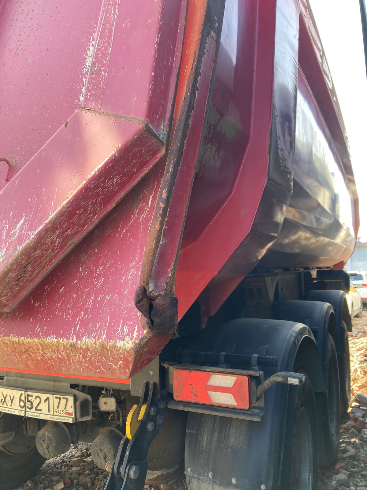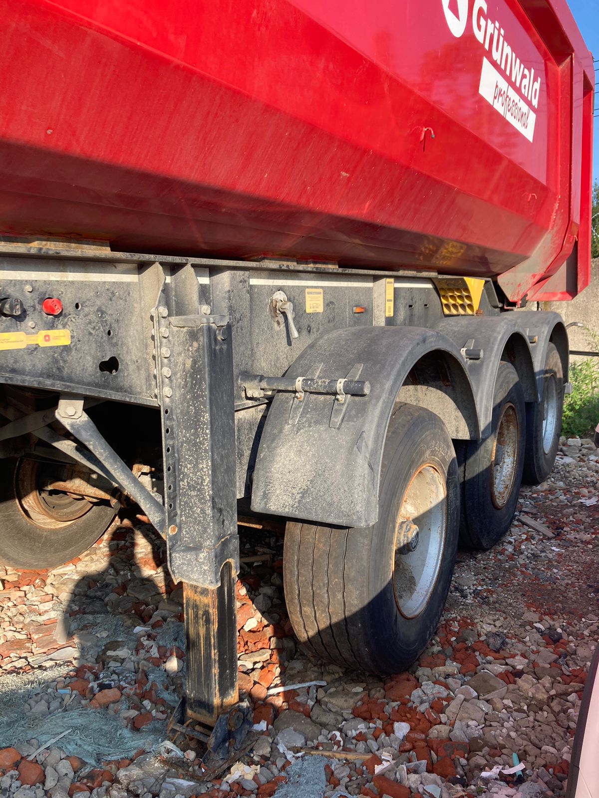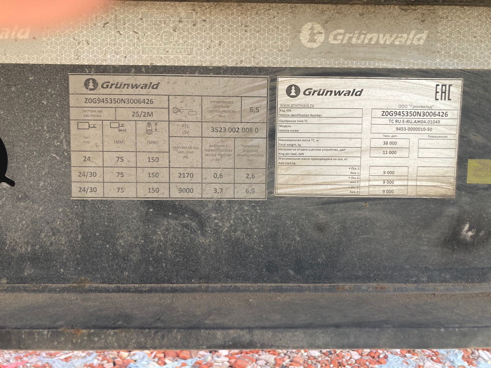 Не на ходу, заблокированы колеса на одной из осей. Полуприцеп самосвал Grunwald 9453-0000010-50 / 9453-0000011-50 Технические характеристики Тип полуприцепа Полуприцеп самосвал Назначение полуприцепа Предназначен для перевозки сыпучих грузов Модель полуприцепа 9453-0000010-50 / 9453-0000011-50 Высота ССУ 1220 мм Цвет рамы На усмотрение Продавца Цвет кузова На усмотрение Продавца Кузов Объем кузова 31 м3 Форма кузова Полукруглый (Half Pipe) Материал кузова Сталь Задний борт Откидной прилегающий борт Подъем кузова Гидроцилиндр (Hyva / Binotto) Подогрев кузова Нет Тент Сворачиваемый (ручное скручивание) Рама Рама Сварная усиленная рама Шкворень 2 дюйма Бампер Стальной Шасси Оси полуприцепа 3 оси (BPW) Нагрузка 9 000 кг. на каждую ось Подвеска Пневматическая Подъемная ось На усмотрение Продавца Тип тормозов Барабанные Тип ABS ABS/EBS (На усмотрение Продавца) с РУ Осей с ABS 1 ось с датчиками ABS