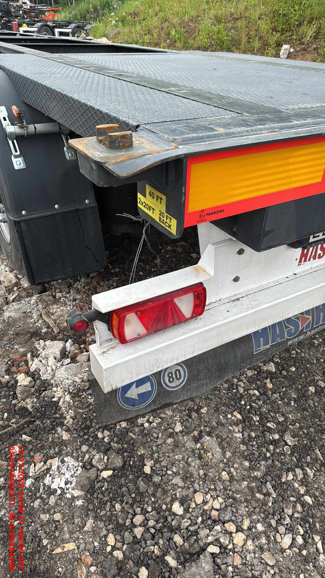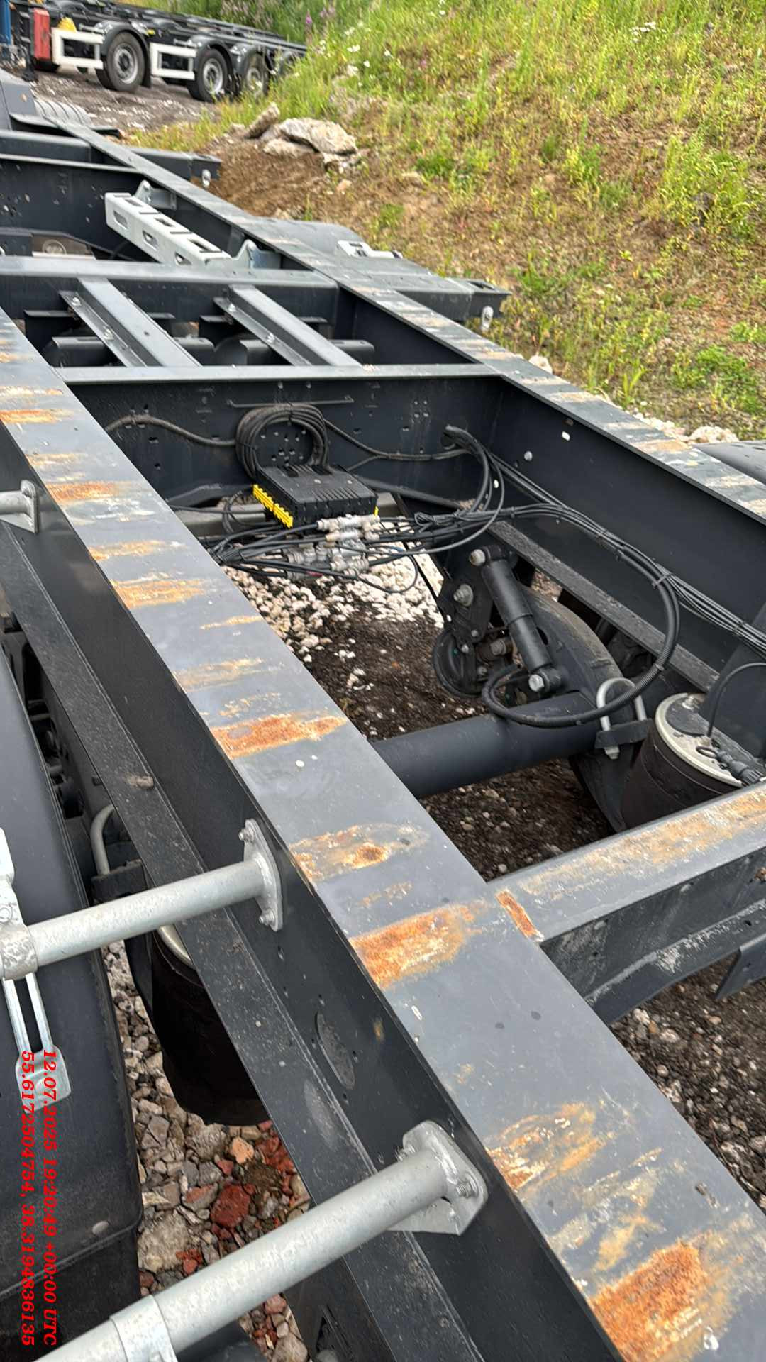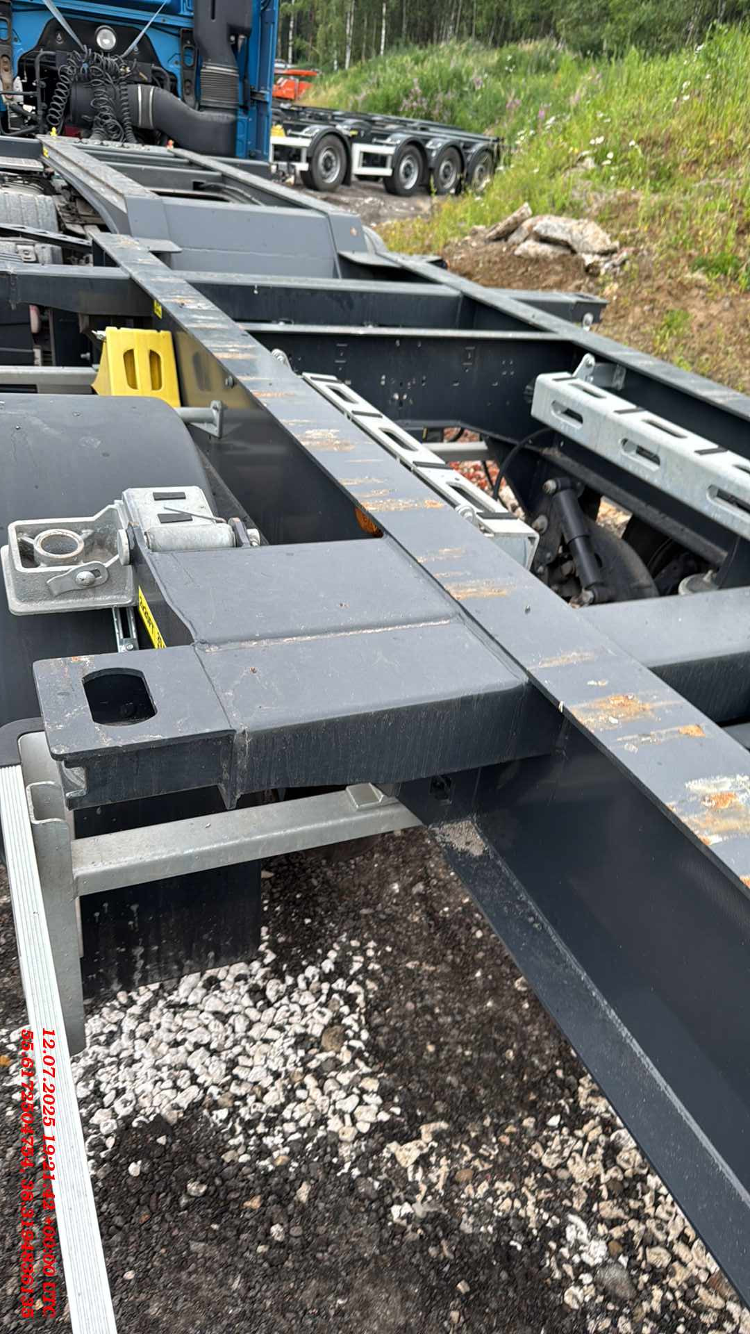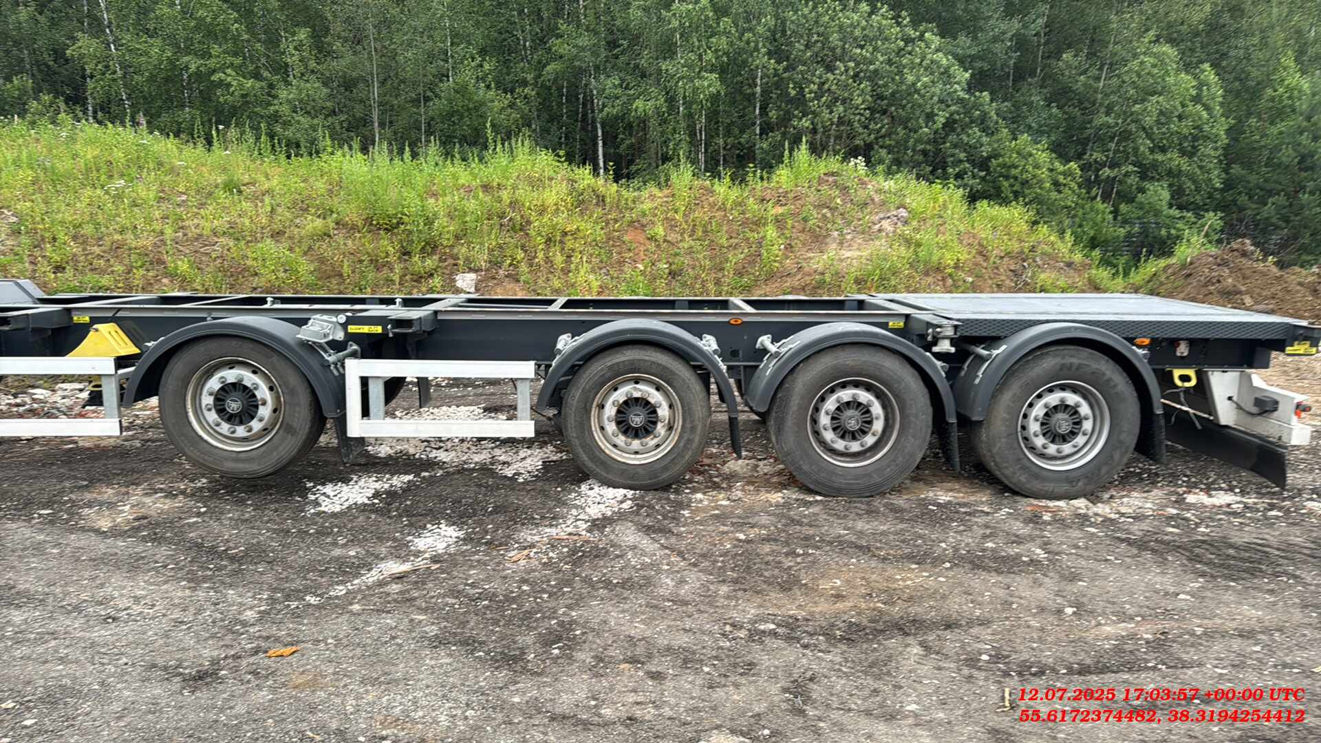 ТЕХНИЧЕСКОЕ ОПИСАНИЕ Шасси: Высокопрочное шасси, изготовленное из стали S700MC (прочнее ST52-3 сталь) с помощью автоматической сварки; Окрас: Пескоструйная обработка в соответствии со стандартом SAE 2.5 перед покраской, затем грунтовка краской на эпоксидной основе с высокой коррозионной стойкостью, и, грунтовка краской на основе цинка, окраска RAL 5002 краской на основе акриловой смолы и сушка в сушильной камере; Сцепное устройство: Шкворень Ø 2 дюйма (50,8 мм) в соответствии со стандартами SAE и DIN; Оси: Пневматическая подвеска с дисковыми тормозами. 4 оси SAF 9 тонн и Подъёмная первая ось; Опоры: Телескопические двухскоростные опорные ноги 2шт х 12 тонн черного цвета; Шины и диски: 8 шин 385/65 R 22.5 HANKOOK на дисках +1 запасное колесо; Крепление контейнера: 1×20 ft сзади, 1×20 ft по центру, 2×20 ft, 1×40 ft; Передная стенка: Стальная, высота 2700мм, изнутри установлена фанерная защита; Крыша: Система раздвижной крыши с системой быстрого и легкого открывания и закрывания с алюминиевой планкой (680 г/м2); Штора: Плотность тента составляет 900 г/м2. (RAL9006); Раздвижные стойки 2×3; Задние алюминиевые двери с петлями 2×5 и встроенным замком и решетками 2×2; Отверствия под коники: профильные отверстия 2×8 шт. ТОРМОЗНАЯ СИСТЕМА И ПОДВЕСКА Тормозная система WEBSITE Plus с 2 модулями и 4 датчиками (4S/2M); RSS (Система стабилизации на дороге). Пневматические тормоза с двойным контуром; Подъем оси с ручными клапанами опускания и подъема. СИСТЕМА ОСВЕЩЕНИЯ Электросистема 24 V в соответствии с Правилами ЕЭК ООН R48.06; Светодиодные боковые, передние и задние габаритные огни с отражателями. Светоотражающая лента расположена по бокам и сзади; Кронштейн с розетками 2×7 pin DIN ISO 1185 и DIN ISO 3731 или 1×15 Pin DIN ISO 12098.