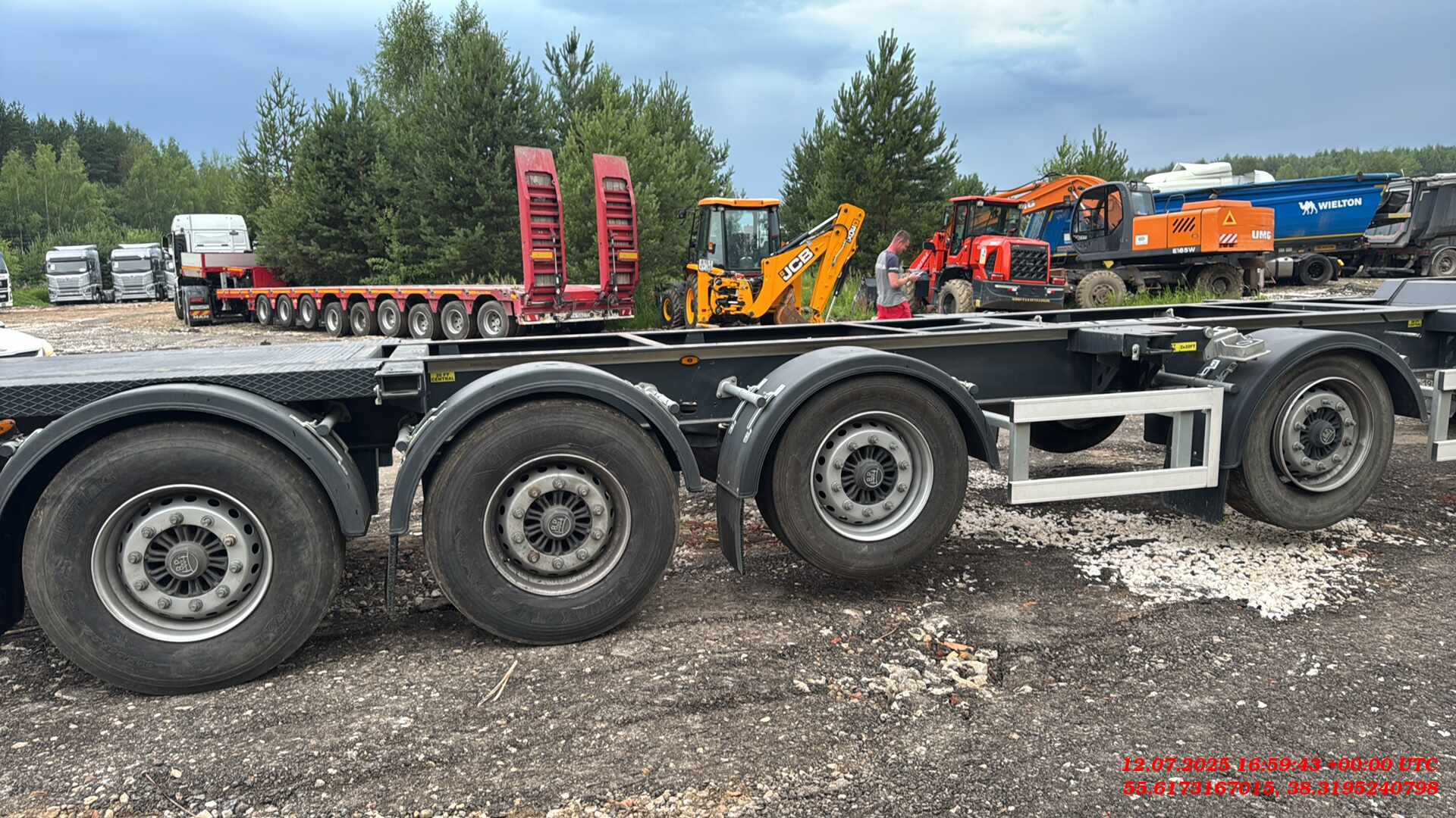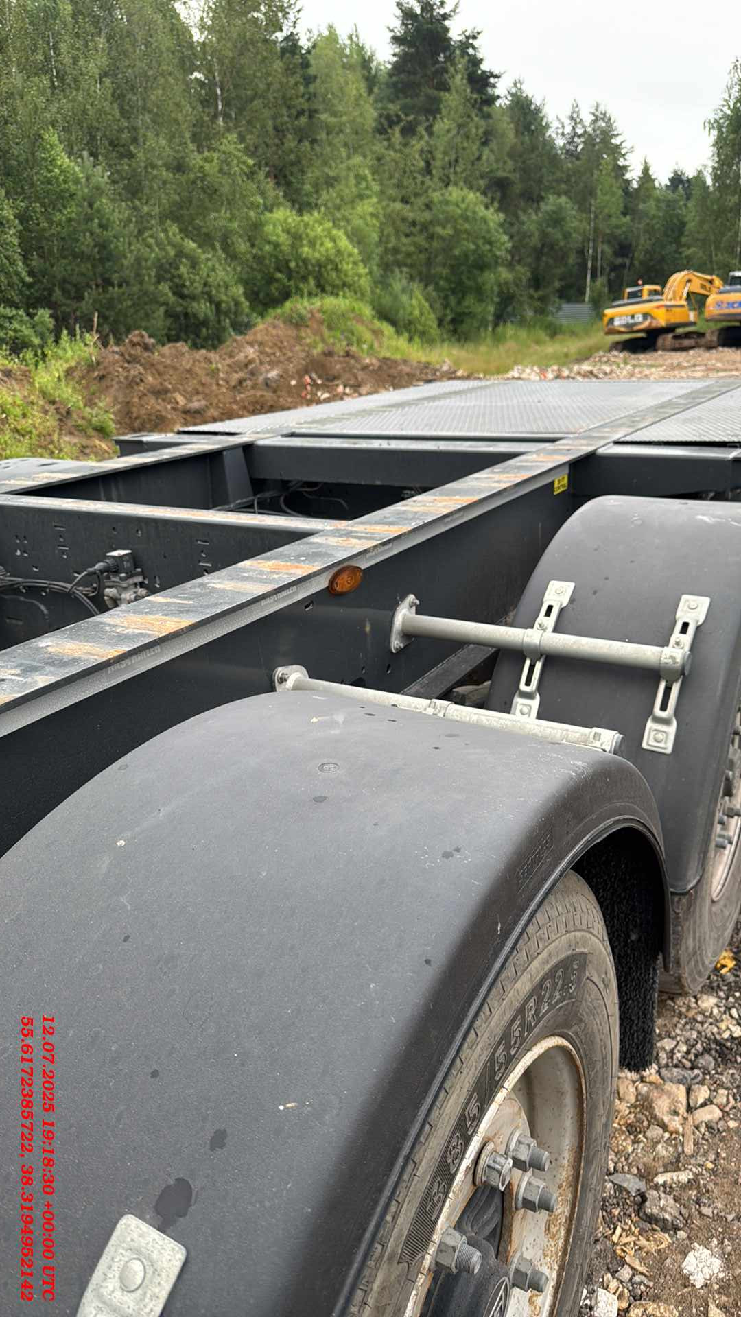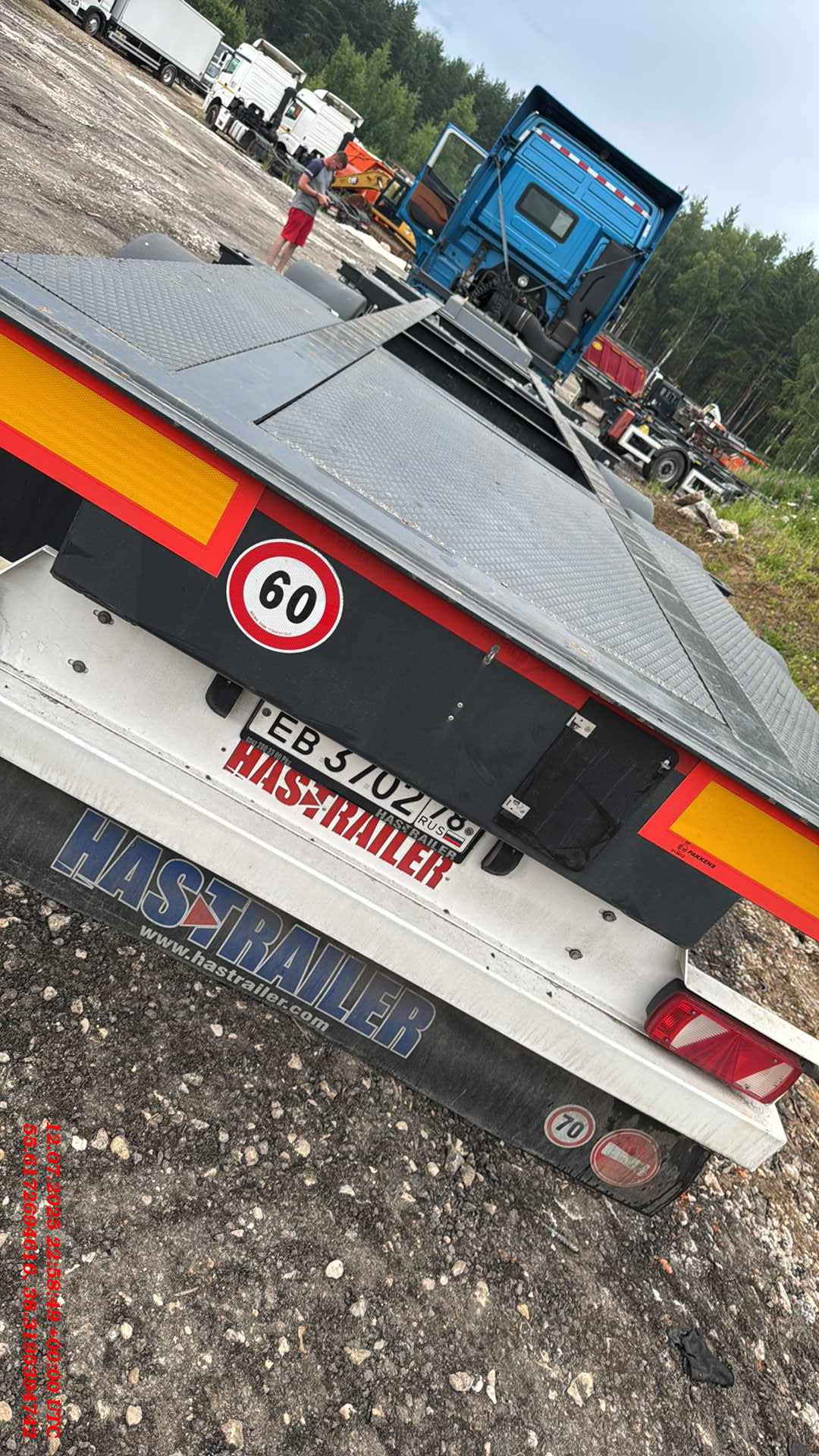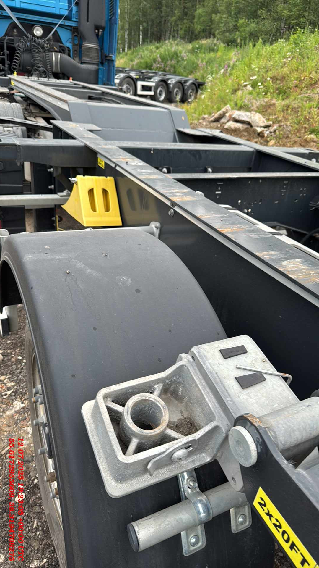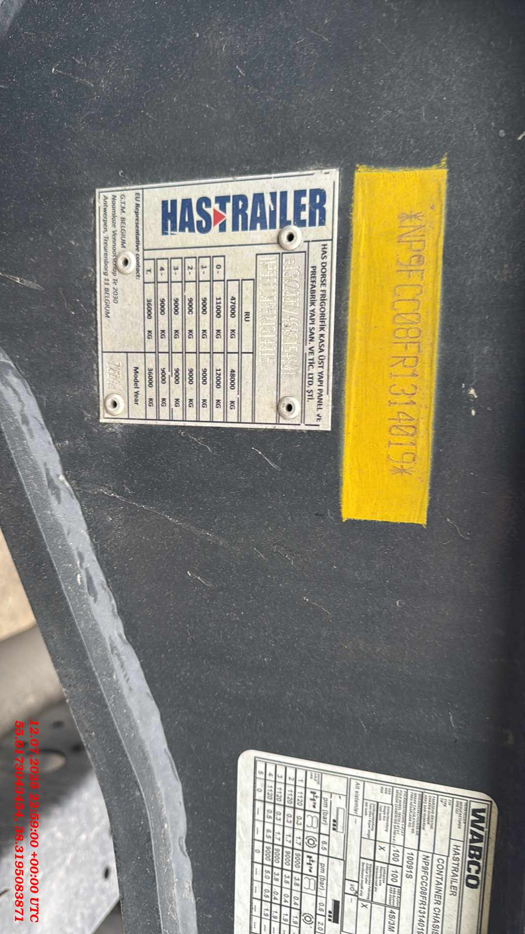 ТЕХНИЧЕСКОЕ ОПИСАНИЕ Шасси: Высокопрочное шасси, изготовленное из стали S700MC (прочнее ST52-3 сталь) с помощью автоматической сварки; Окрас: Пескоструйная обработка в соответствии со стандартом SAE 2.5 перед покраской, затем грунтовка краской на эпоксидной основе с высокой коррозионной стойкостью, и, грунтовка краской на основе цинка, окраска RAL 5002 краской на основе акриловой смолы и сушка в сушильной камере; Сцепное устройство: Шкворень Ø 2 дюйма (50,8 мм) в соответствии со стандартами SAE и DIN; Оси: Пневматическая подвеска с дисковыми тормозами. 4 оси SAF 9 тонн и Подъёмная первая ось; Опоры: Телескопические двухскоростные опорные ноги 2шт х 12 тонн черного цвета; Шины и диски: 8 шин 385/65 R 22.5 HANKOOK на дисках +1 запасное колесо; Крепление контейнера: 1×20 ft сзади, 1×20 ft по центру, 2×20 ft, 1×40 ft; Передная стенка: Стальная, высота 2700мм, изнутри установлена фанерная защита; Крыша: Система раздвижной крыши с системой быстрого и легкого открывания и закрывания с алюминиевой планкой (680 г/м2); Штора: Плотность тента составляет 900 г/м2. (RAL9006); Раздвижные стойки 2×3; Задние алюминиевые двери с петлями 2×5 и встроенным замком и решетками 2×2; Отверствия под коники: профильные отверстия 2×8 шт. ТОРМОЗНАЯ СИСТЕМА И ПОДВЕСКА Тормозная система WEBSITE Plus с 2 модулями и 4 датчиками (4S/2M); RSS (Система стабилизации на дороге). Пневматические тормоза с двойным контуром; Подъем оси с ручными клапанами опускания и подъема. СИСТЕМА ОСВЕЩЕНИЯ Электросистема 24 V в соответствии с Правилами ЕЭК ООН R48.06; Светодиодные боковые, передние и задние габаритные огни с отражателями. Светоотражающая лента расположена по бокам и сзади; Кронштейн с розетками 2×7 pin DIN ISO 1185 и DIN ISO 3731 или 1×15 Pin DIN ISO 12098.