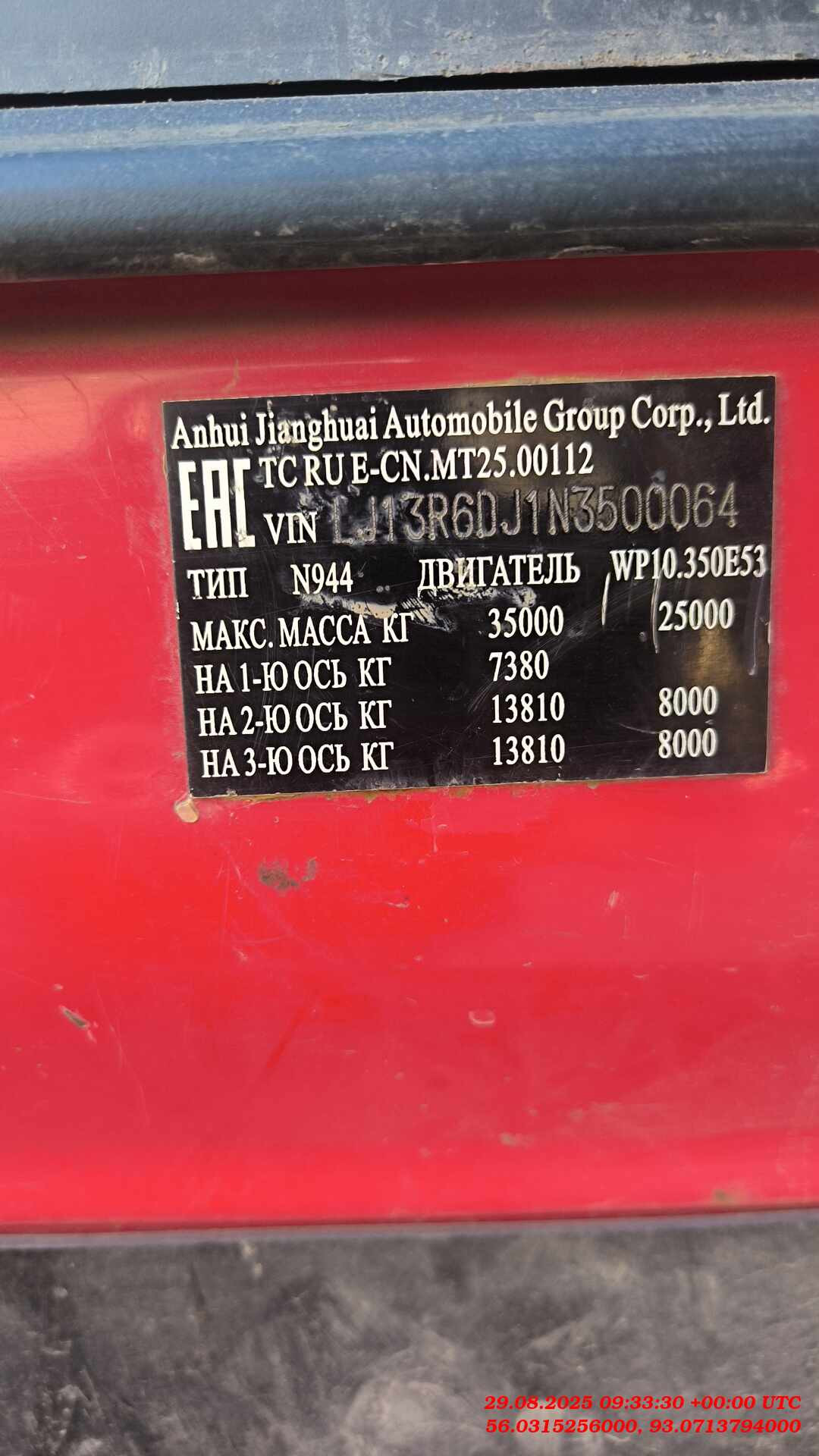 Номер лота: 000015381 Ответственный за реализацию: Тарасенко Артем Вячеславович Параметр Значение параметра Колесная формула / ведущие колеса 6 x 4 / задние Схема компоновки транспортного средства кабина над двигателем Расположение двигателя переднее продольное Кабина Цельнометаллическая, двухдверная, двухместная с 1 спальным местом, откидывающаяся вперед, подвеска кабины: на 4 х гидравлических амортизаторах с гидрозамком, с автономным жидкостным предпусковым подогревателем кабины, сиденье с пневмоподвеской. Кабина с внешними осветительными приборами, обеспечивает отличное освещение проезжей части в условиях плохой видимости. Кондиционер Да Радио FM/AM с USB Да Электропривод стеклоподъёмников Да Передние противотуманные фары Да Габаритные размеры База, мм: 4100+1350 Колея передних / задних колес, мм 2040/1870 Длина*Ширина*Высота 8820*2550*3450 Кузов Размер: 5800х2300х1500(+/ 15 20мм), 20м3 с задней разгрузкой, с обогревом, на верхней навеске с автоматическими запорами, защитный козырек между кабиной и самосвальной платформой, с боковой противоподкатной защитой с двух сторон, с креплением запасного колеса на передней панели Толщина бортов Днище 8мм/ Борта 6 мм Гидроподъёмник HYVA 137 Масса Масса транспортного средства в снаряженном состоянии, кг 16 082 Технически допустимая максимальная масса транспортного средства, кг 35 000 Технически допустимая грузоподъёмность, кг 18 918 Двигатель Марка, тип WP10.350E53, WEICHAI количество и расположение цилиндров 6, рядное рабочий объем цилиндров, см 3 9726 максимальная мощность, кВт/ л. с. (мин 1 ) 252 кВт/343 л.с. (1900 мин 1) максимальный крутящий момент,Нм (мин 1 1600) Нм (1200~1500 мин 1 Топливо Дизельное Система питания (тип) впрыск топлива под давлением блок управления (маркировка) BOSCH, WPEDC7 ТНВД (тип, маркировка) BOSCH, WPCPN2 форсунки (маркировка) BOSCH, WPCRIN2 Нагнетатель воздуха Турбокомпрессор (тип, маркировка) HONEYWELL, GT40 воздушный фильтр (тип, маркировка) сухой с бумажным элементом,28000 Y3A20, HEFEI YILI Система выпуска и нейтрализации отработавших газов один глушитель со встроенным нейтрализатором отработавших газов Глушители (маркировка) WPSCR 002, WEICHAI