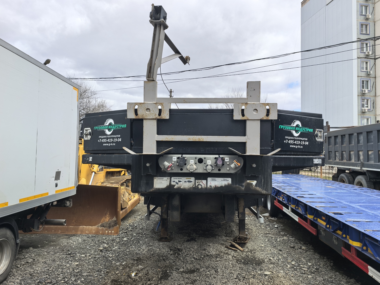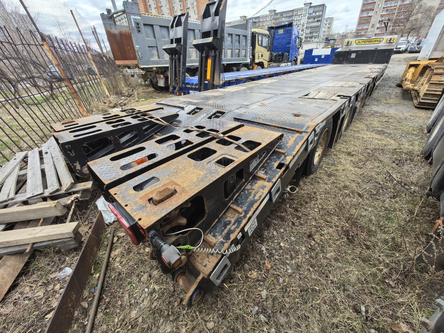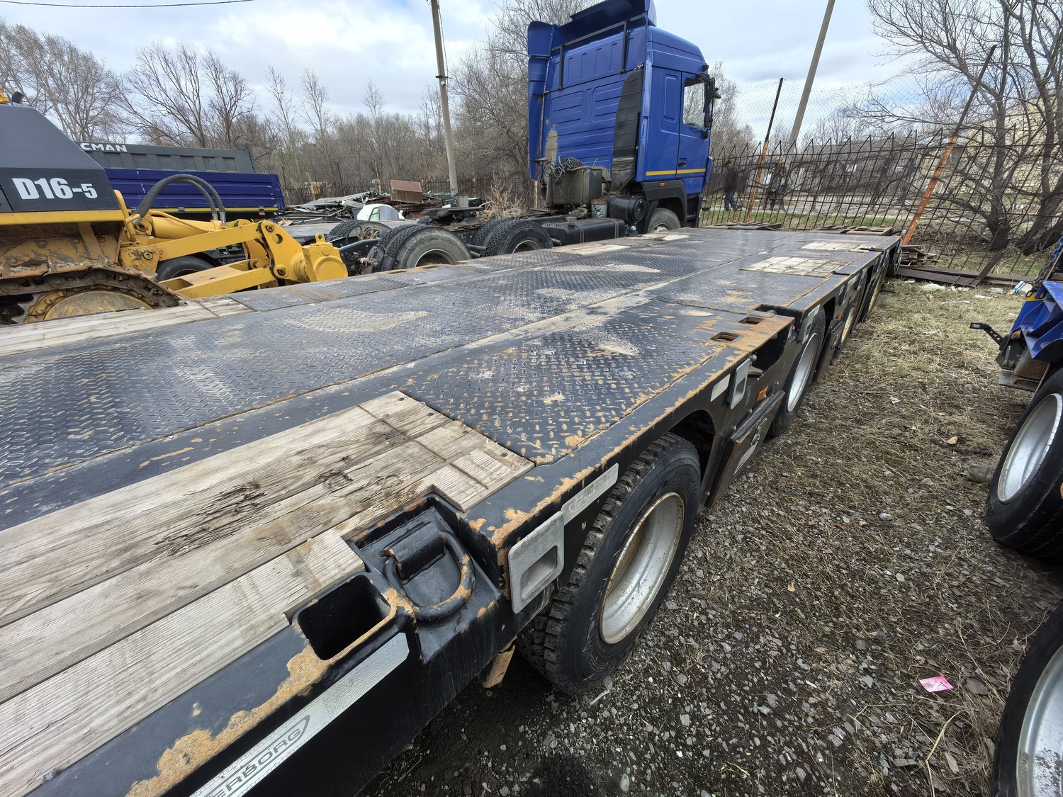 Ответственный за реализацию: Кирилин Александр Номер лота: 000008644 Технические характеристики Характеристика массы Грузоподъемность (max), кг. 50 000 Собственная масса, кг. 12 500 Полная масса, кг. 62 500 Нагрузка на ССУ, кг. 18 500 Нагрузка на оси, кг. 44 000 Габаритные размеры полуприцепа Общая длина, мм. 16 405 Ширина/ с уширителями, мм. 2 500/ 3 000 Погрузочная платформа Погрузочная высота, мм. 900 Длина рабочей платформы, мм. 12 300 Ширина рабочей платформы/ с уширителями, мм. 2 500/ 3 000 Настил платформы Комбинированный (металл+дерево) Гусачная часть Шкворень, дюйм.(мм.) 2 Высота ССУ, мм. 1 300 Радиус ометания, мм. 2 300 Опорное устройство 24 тн., механическое, телескопического (винтового) типа с односторонним управлением (Германия) Настил платформы (гусак) Металл (рифленый) Ходовая часть Количество осей, шт. (подъемные/самоустанавливающаяся) 4 (1/1) – 1ая подъемная, 4ая поворотная Межосевое расстояние, мм. 1500/1500/1500 Подвеска (тип) Пневматическая, зависимая Оси, производитель Alion Количество колес (запасных) 16 (2) Диски Стальные Шины (размерность) Пневматические 235/75 R17.5 Ошиновка Двускатная Тормозная система Рабочая тормозная система Барабанная, колодочная на все колеса с пневматическим приводом от тягача по ГОСТ, с ABS Система пневмопривода тормозов С энергоаккумуляторами Трапы Тип, шт. Уголковые аппарели Ширина трапа, мм. 350 Смещение: направление До уширения Угол заезда по трапам, градусы 14-16° Электрооборудование Напряжение, В 24В стандарт, двухпроводное, с питанием от тягача, количество и расположение приборов в соответствии с ГОСТ, ЕСЕ и АDR, разъемное соединение в соответствии с ЕСЕ Дополнительно оборудование Борта на гусачной части (высота, мм.) Алюминиевые, 400 Уширители рабочей платформы, тип Выдвижной Настил для уширителей Доска (50 мм.) в металлическом поддоне (3 мм.) Инструментальные ящики, шт. Установлены Противооткатные упоры, расположенные на специальном кронштейне, шт. 2 (Германия) Кран подъема запасного колеса Установлен Дополнительная опорная лапа Установлена Петля для увязки груза, шт. (расположение) 14 (по периметру) Дополнительные места для увязки груза в боковом швеллере, шт. 8 Съемная боковая защита в соответствии с ЕСЕ Установ Алюминиевая, установлена Знаки «Негабаритный груз», шт. 4 (выдвижные, с пульсацией) Стаканы под коники (стойки), шт. 10 Контейнерные замки 2*20 фут, 1*40 фут
