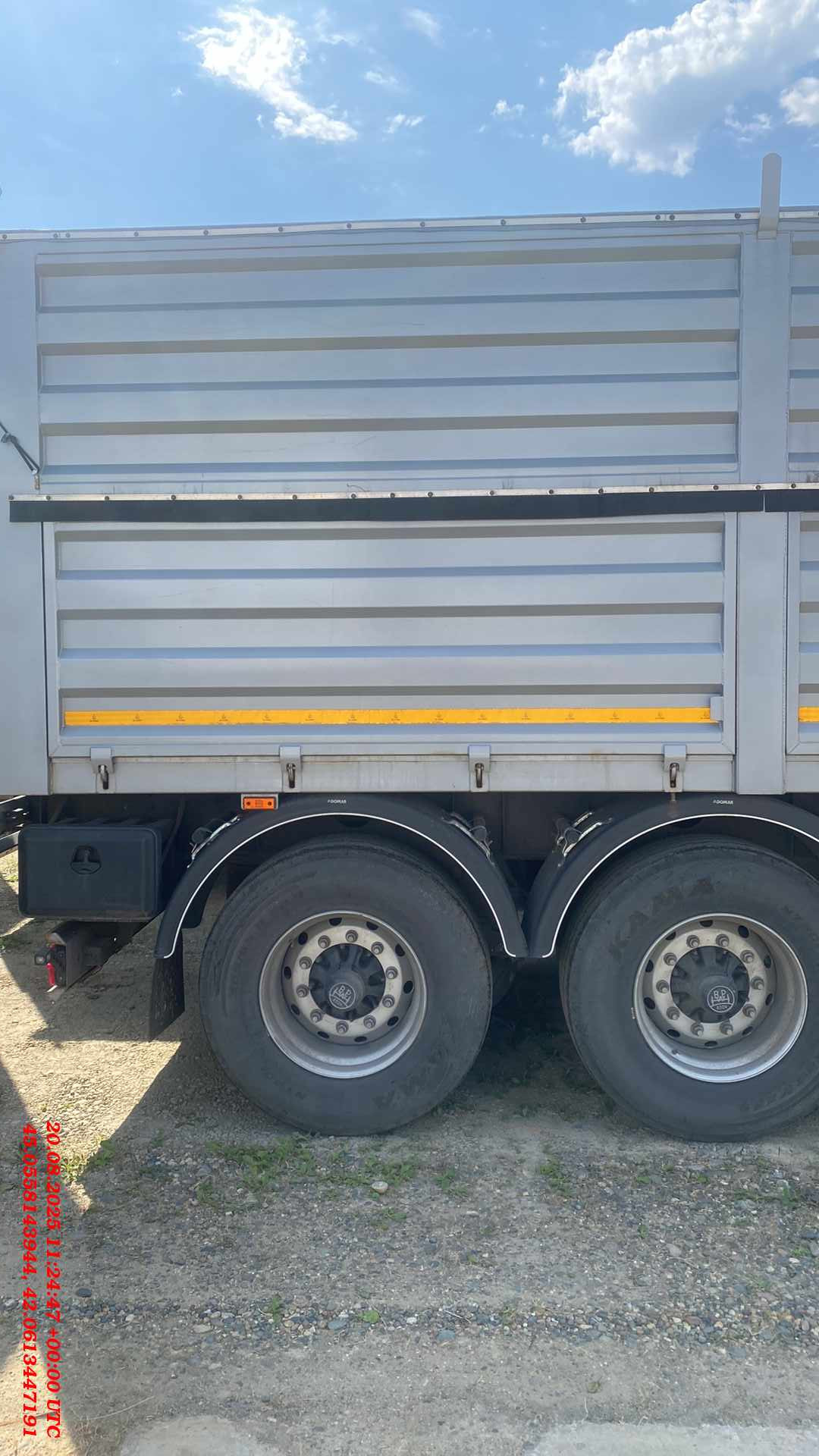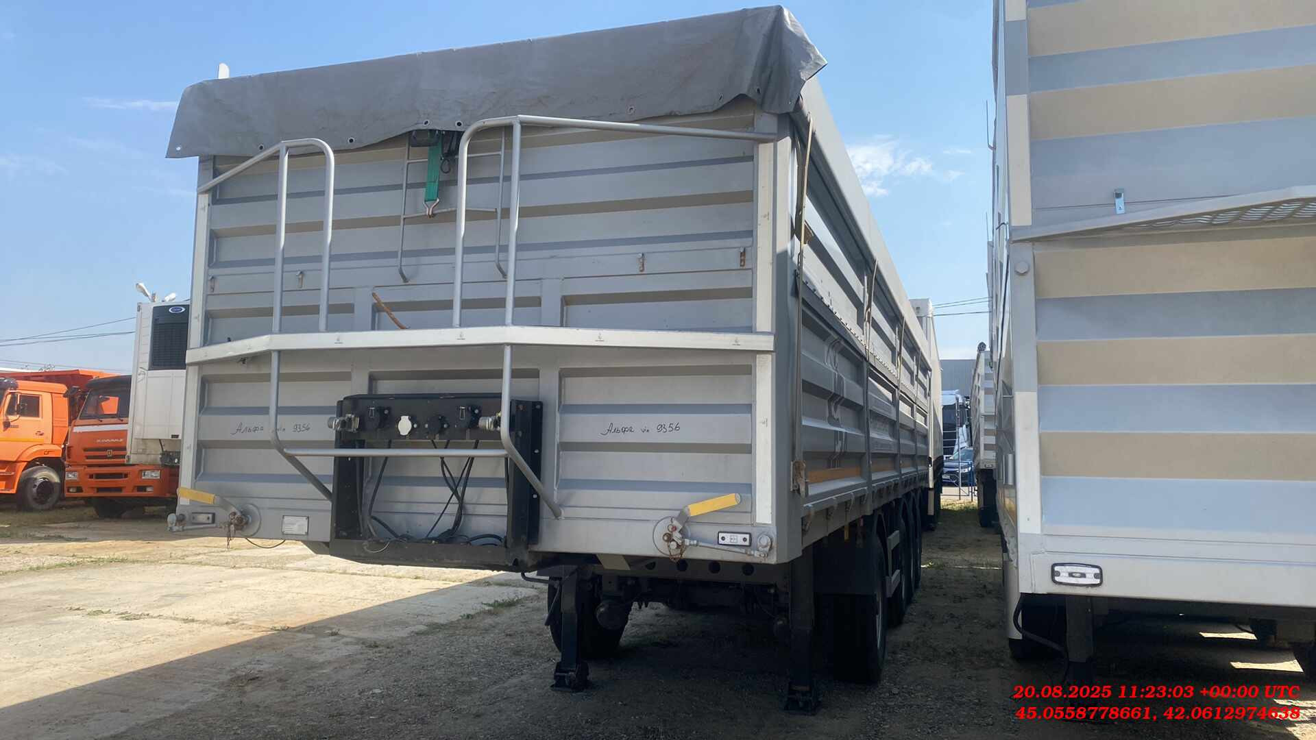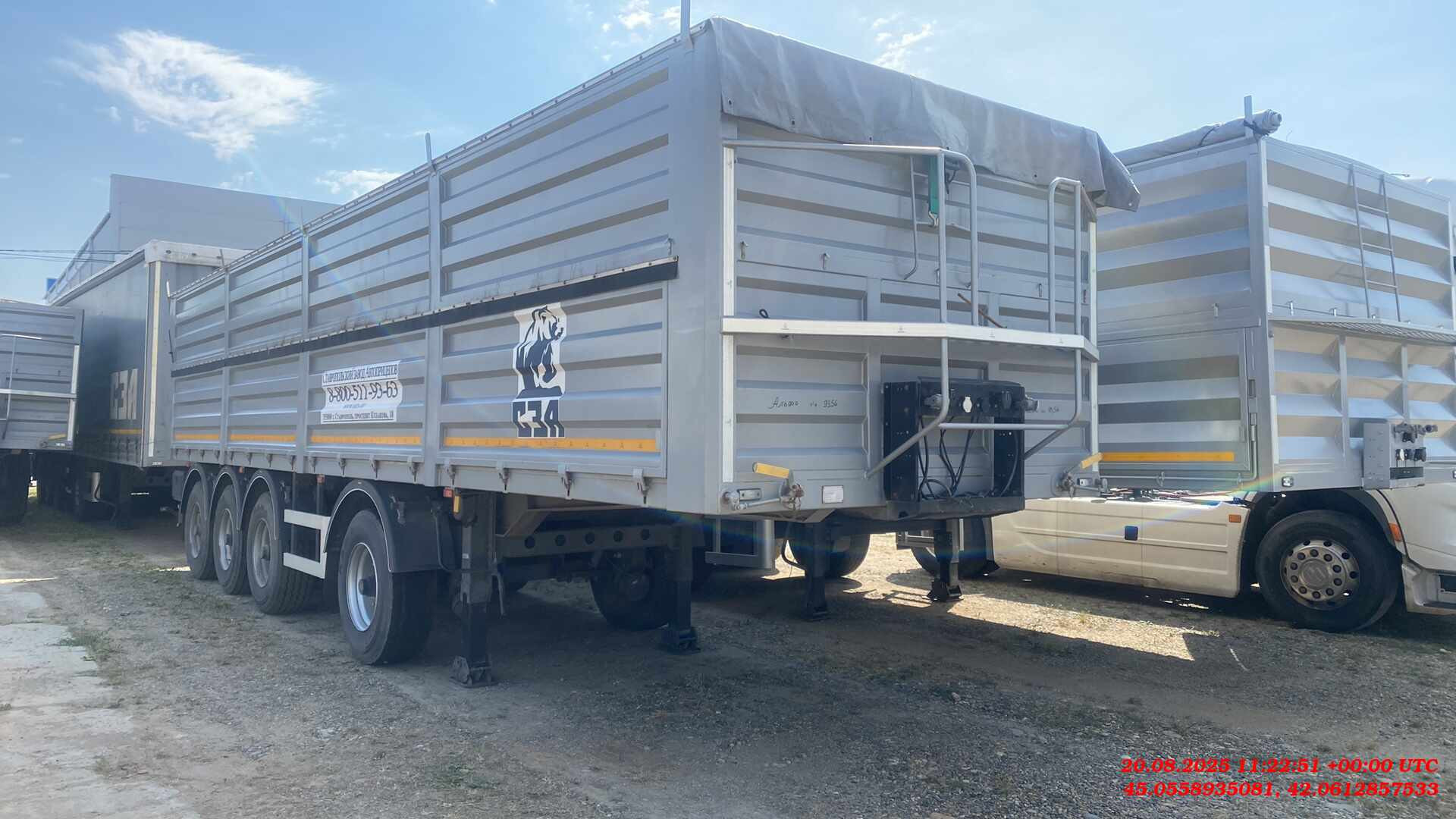 Бортовой 4-х осный полуприцеп предназначен для перевозки различных видов сыпучих сельскохозяйственных грузов плотностью 0,25 — 0,85 т/м³. Конструкция и форма бортов обеспечивает высокую жесткость платформы и предотвращает ее деформацию и потерю груза даже при значительном перегрузе. Размеры полуприцепа (ориентировочно) Длинна габаритная (мм) Ширина габаритная (мм) Высота габаритная (мм) Внутренняя длина кузова (мм) Внутренняя ширина кузова (мм) Внутренняя высота кузова (мм) 11130 2550 3250 10500 2480 1800 1. Технические характеристики Внутренний объем кузова (м³) 46 Высота седельно-сцепного устройства минимальная (мм) 1150 Грузоподъемность полуприцепа технически допустимая(кг) 48000 Нагрузка на ССУ допустимая (кг) 12000 Максимальная полная масса автопоезда (кг) 44000 Расстояние от крайней передней точки до шкворня (мм) 670 Снаряженная масса полуприцепа (кг) ±5% 6600 Передний радиус обметания, не более (мм) 2040 Межосевое расстояние (мм) 2510/1310/1310 Колесная колея (мм) 2040 Нагрузка на ось, допустимая (кг) 9000/7500/7500/7500 Колея кронштейнов подвески (мм) 1300 2. Техническое описание Шасси • Сварная рама усиленной конструкции из двух лонжеронов двутаврового сечения из стали 09г2С/10ХСНД (соответствует Hardox 600/700) • Опорное устройство двухскоростное с ручным односторонним приводом BPW (Германия), грузоподъемность 24 т, ручка управления с правой стороны; • Шкворень BPW (Германия), 2 дюйма (соответствует ЕЭК ООН № 55.00); • Два противооткатных упора; • Съемная корзина запасного колеса; • Боковая алюминиевая защита; • Заднее защитное устройство, с рамкой регистрационного знака; • Пластиковые крылья Domar (Италия) над каждым колесом; • Умывальник с мыльницей Daken (Италия); • Инструментальный ящик Daken (Италия); Кузов • Кузов объемом 46 м3, с выгрузкой на левую и правую сторону; • Толщина профиля борта — 1,5 мм - сталь 8ПС; • Толщина настила пола — 2,5 мм - сталь 8ПС; • Откидные боковые борта высотой 850 мм в нижней части кузова (с левой и правой стороны) с верхней навеской (4 борта на каждой стороне); • Распашные ворота (оборудованы ступеньками для обслуживания полога); • Запорная фурнитура бортов (binotto Италия / Hestal Германия / СЗА); • Каждый борт открывается отдельно с каждой стороны; • Резиновая влагозащитная полоса в верхней части откидных бортов; • Ступеньки на передней стенке внутри кузова для доступа внутрь; • Стяжки внутри кузова (съемные); • Резиновые уплотнители по внутреннему периметру бортов; • Светоотражающая маркировка. Подвеска • 4 х 9000 кг BPW (Германия); • Пневматическая подвеска BPW (Германия) - легкие осевые балки с высокими прочностными характеристиками. • Механизм подъема первой и четвертой оси; • Тормозные механизмы дискового типа. Шины и диски • Ошиновка односкатная (колесная формула 8+1 (запасное); • Шины размерности 385/65 R22.5; • Диски стальные Тормозная система • Пневматическая электронная тормозная система WABCO/Knor-Bremse; • Датчики ABS на двух из четырех осей; • Стальные воздушные ресиверы; • Тормозные камеры мембранного типа; • Стояночная тормозная система полуавтоматического типа с пружинными энергоаккумуляторами на трех осях; • Пневматические соединительные головки для подключения на гибких шлангах; Электрооборудование • Электрооборудование (Германия/ Австрия/Россия); • Две 7-ми- клемовые и одна 15-ти-клемовая розетки; • Розетка ABS; • Два задних комбинированных фонаря с функцией габаритных 