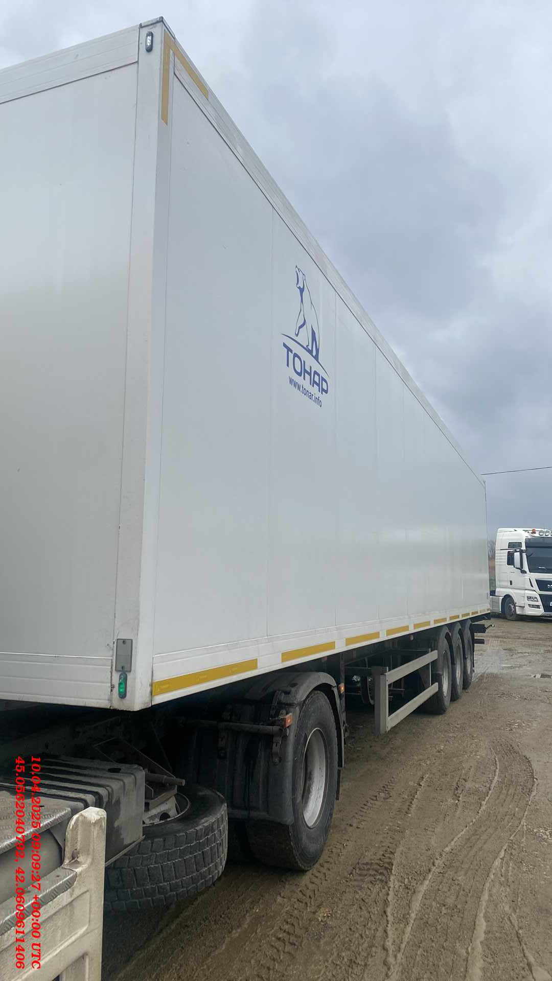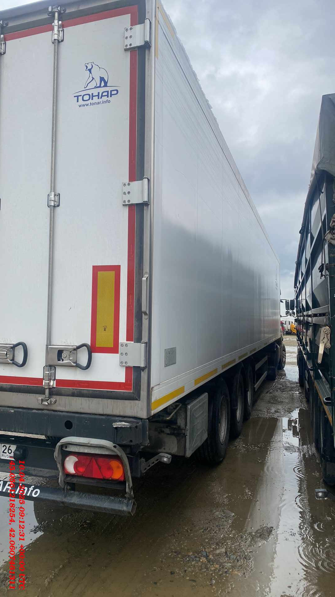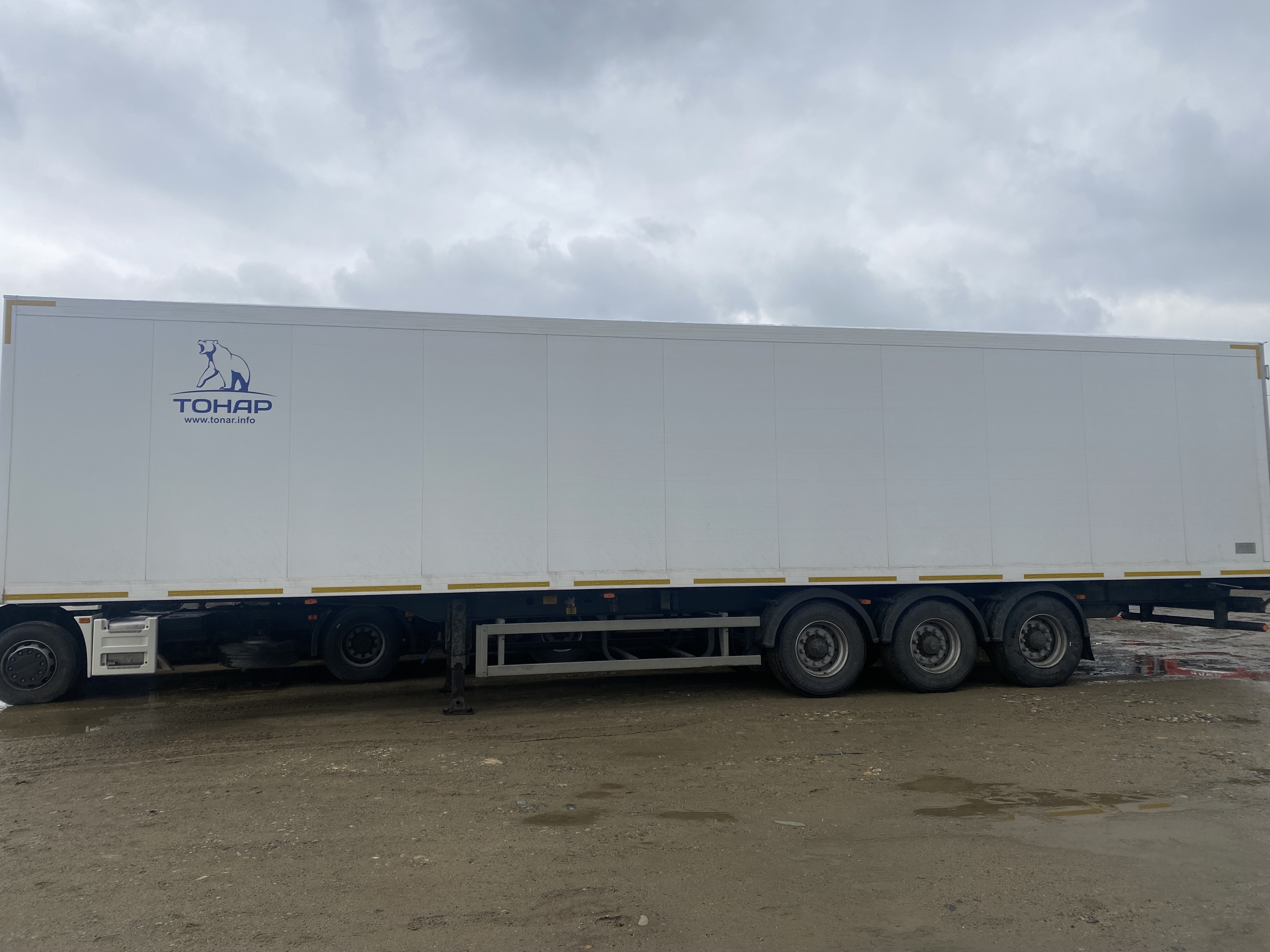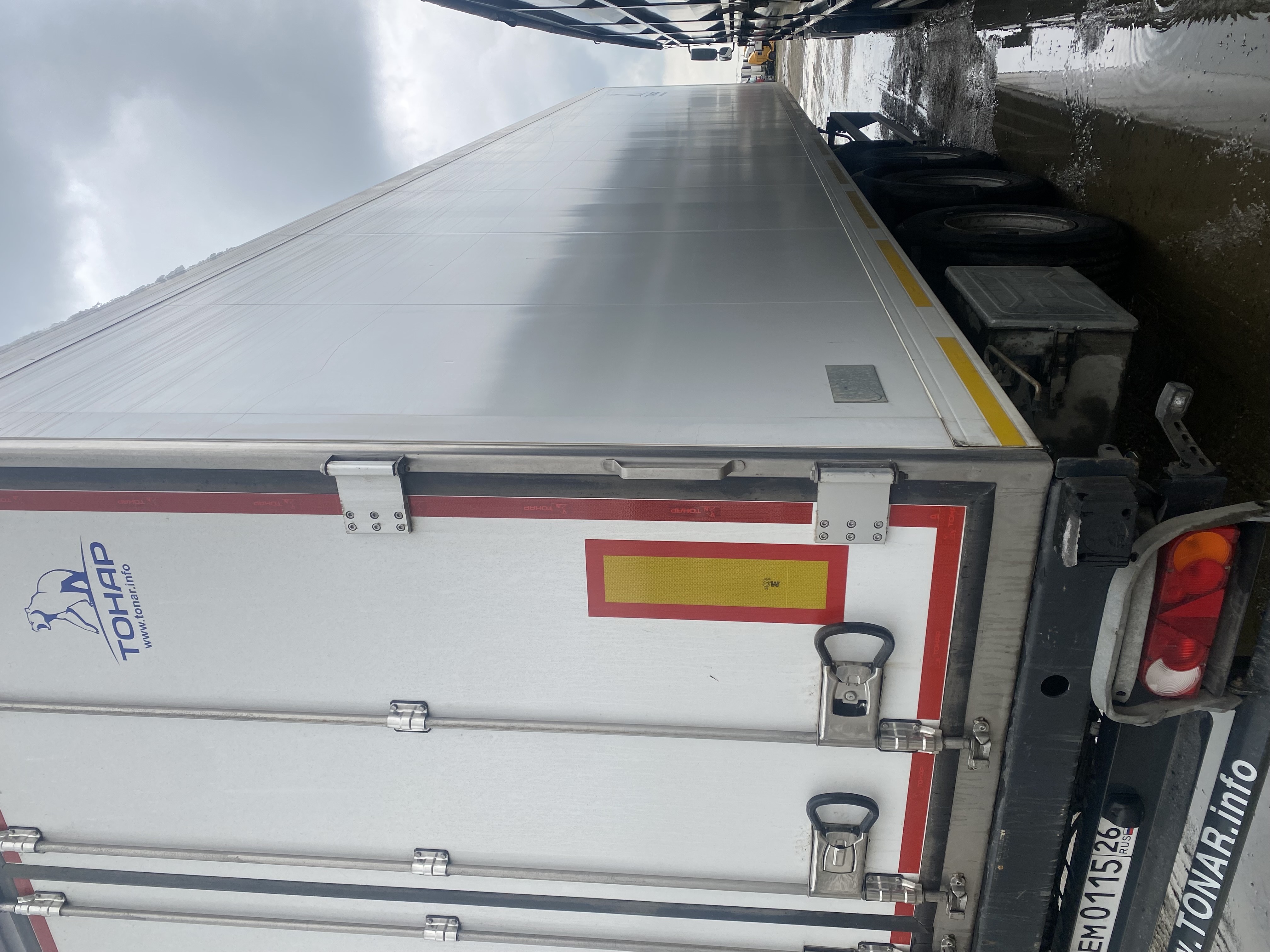Технические характеристики: Масса перевозимого груза, не более, кг 30040 Масса снаряженного полуприцепа (прицепа), не более, кг 7960 Полная масса полуприцепа (прицепа), не более, кг 38000 Нагрузка на седло (седельно-сцепное устройство), кг 10791 Высота седла (седельно-сцепного устройства), мм 1150 Длина 13890 Ширина 2600 Высота 4000 Внутренняя высота кузова 2560 Рама • Лонжероны двутаврового сечения • Повышенной прочности • Процесс сварки происходит в аргоновой среде сварочными тракторами и роботами Шасси • 3-осное • Оси Тонар с дисковым тормозным механизмом • Нагрузка на ось 9 тонн (технически допустимая) • Межосевое расстояние 1360мм • Подвеска рычажного типа. • Подъёмная первая ось (в базовой комплектации) • Сцепной шкворень 2 дюйма • Задний противоподкатный брус Кузов • Полуприцеп – изотермический ТОНАР, модель 97861 • Кузов – с усиленной изоляцией, сертифицирован и отвечает правилам СПС • Толщина боковых стенок – 65 мм, крыши и переднего борта – 80 мм, ворота – 85 мм, пол 123 мм. • Срок действия сертификата СПС – до 2024 г. Тормозная система • Дисковые тормоза • Стояночная тормозная система - механический привод с пружинными энергоаккумуляторами на средней и задней осях и пневматическим ручным краном управления; • Аварийная тормозная система – механический привод с пружинами энергоаккумуляторами на средней и задней осях к тормозным механизмам колёс. Электросистема • 24В • задние огни в комплекте с сигналом заднего хода, противотуманной фарой, указателями поворота и отражателями света • освещение номерного знака • габаритные огни • щиты отражателей света • 2 розетки и розетка ABS Окраска • Все стальные элементы перед окраской проходят дробеструйную обработку • Два слоя грунта • Краска: двухкомпонентная Колеса • Резина: 385/65 R22.5 • Диски: 11,75 х 22,5 • Ошиновка односкатная • Количество колёс: 6+1 запасное Прочее оборудование • Инструментальный ящик • Место под два запасных колеса • Противооткатные упоры: пластиковые, 160 мм, 2шт.