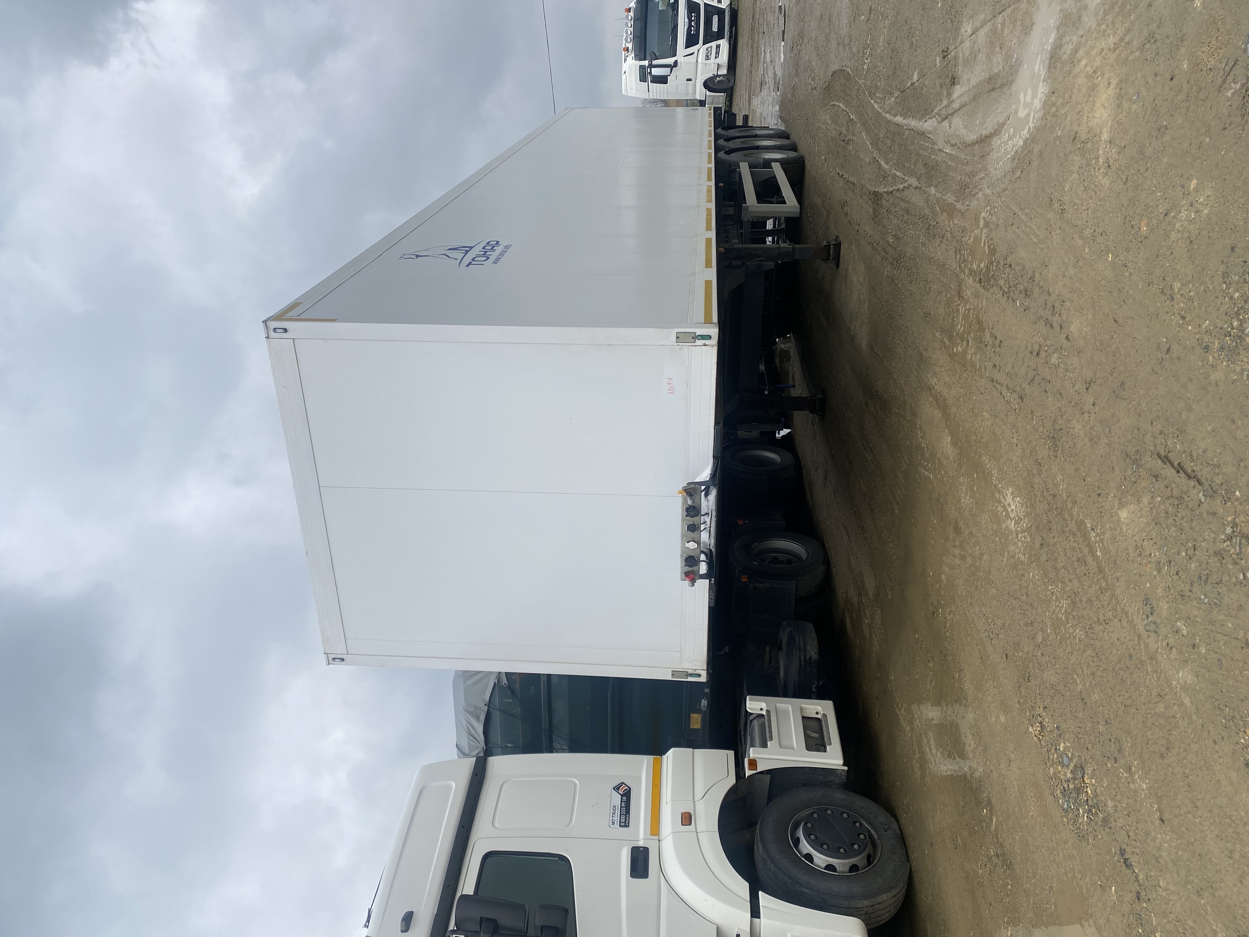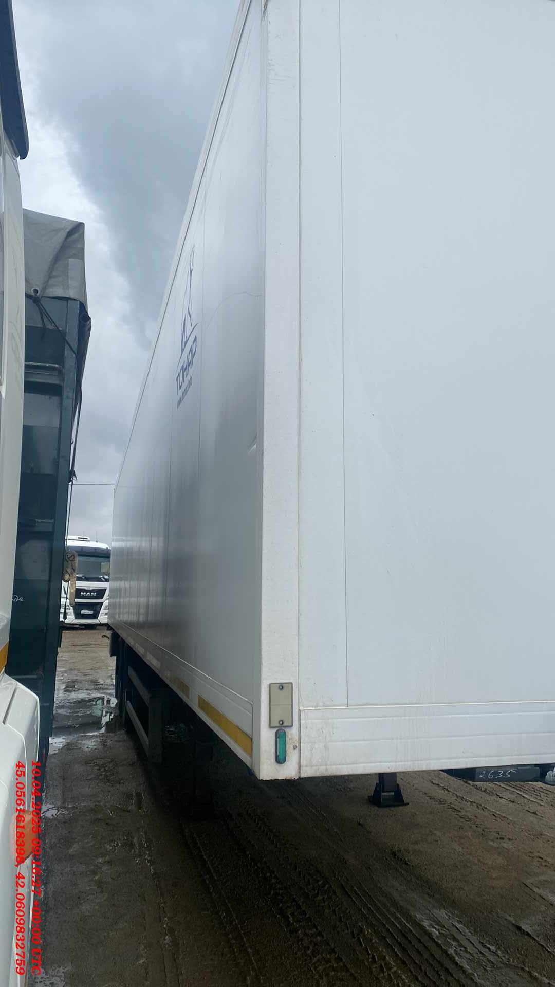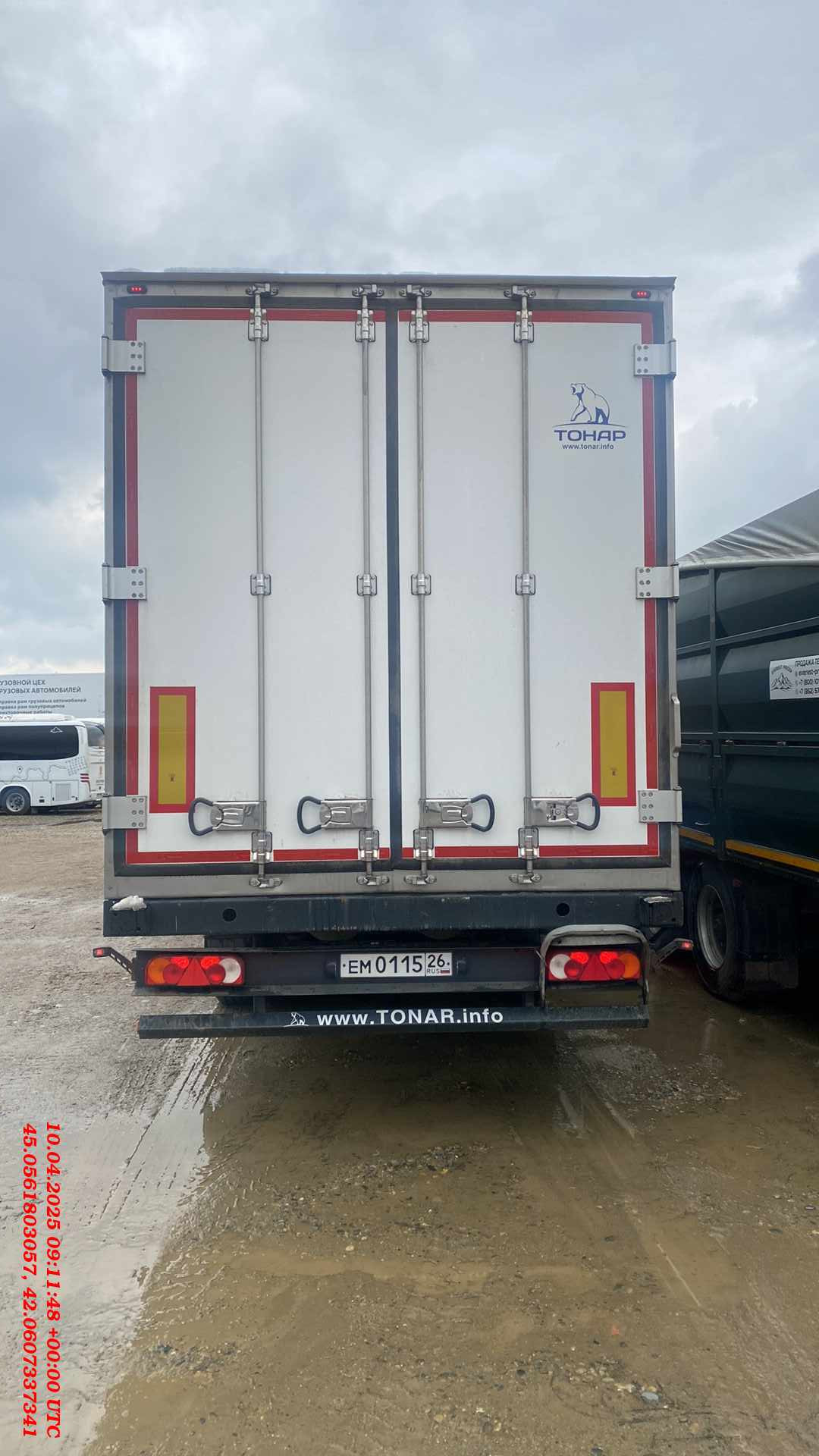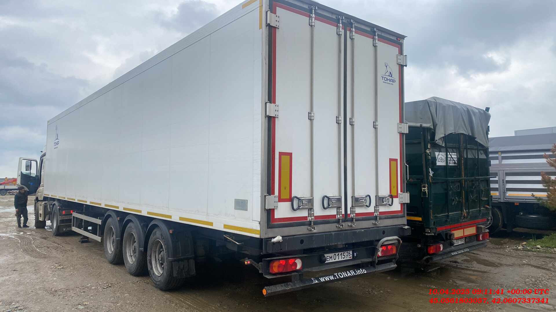 Технические характеристики: Масса перевозимого груза, не более, кг 30040 Масса снаряженного полуприцепа (прицепа), не более, кг 7960 Полная масса полуприцепа (прицепа), не более, кг 38000 Нагрузка на седло (седельно-сцепное устройство), кг 10791 Высота седла (седельно-сцепного устройства), мм 1150 Длина 13890 Ширина 2600 Высота 4000 Внутренняя высота кузова 2560 Рама • Лонжероны двутаврового сечения • Повышенной прочности • Процесс сварки происходит в аргоновой среде сварочными тракторами и роботами Шасси • 3-осное • Оси Тонар с дисковым тормозным механизмом • Нагрузка на ось 9 тонн (технически допустимая) • Межосевое расстояние 1360мм • Подвеска рычажного типа. • Подъёмная первая ось (в базовой комплектации) • Сцепной шкворень 2 дюйма • Задний противоподкатный брус Кузов • Полуприцеп – изотермический ТОНАР, модель 97861 • Кузов – с усиленной изоляцией, сертифицирован и отвечает правилам СПС • Толщина боковых стенок – 65 мм, крыши и переднего борта – 80 мм, ворота – 85 мм, пол 123 мм. • Срок действия сертификата СПС – до 2024 г. Тормозная система • Дисковые тормоза • Стояночная тормозная система - механический привод с пружинными энергоаккумуляторами на средней и задней осях и пневматическим ручным краном управления; • Аварийная тормозная система – механический привод с пружинами энергоаккумуляторами на средней и задней осях к тормозным механизмам колёс. Электросистема • 24В • задние огни в комплекте с сигналом заднего хода, противотуманной фарой, указателями поворота и отражателями света • освещение номерного знака • габаритные огни • щиты отражателей света • 2 розетки и розетка ABS Окраска • Все стальные элементы перед окраской проходят дробеструйную обработку • Два слоя грунта • Краска: двухкомпонентная Колеса • Резина: 385/65 R22.5 • Диски: 11,75 х 22,5 • Ошиновка односкатная • Количество колёс: 6+1 запасное Прочее оборудование • Инструментальный ящик • Место под два запасных колеса • Противооткатные упоры: пластиковые, 160 мм, 2шт.
