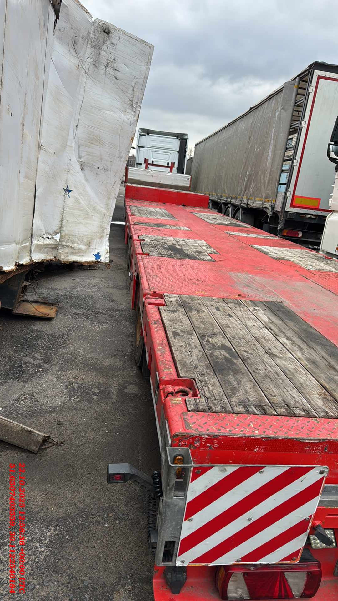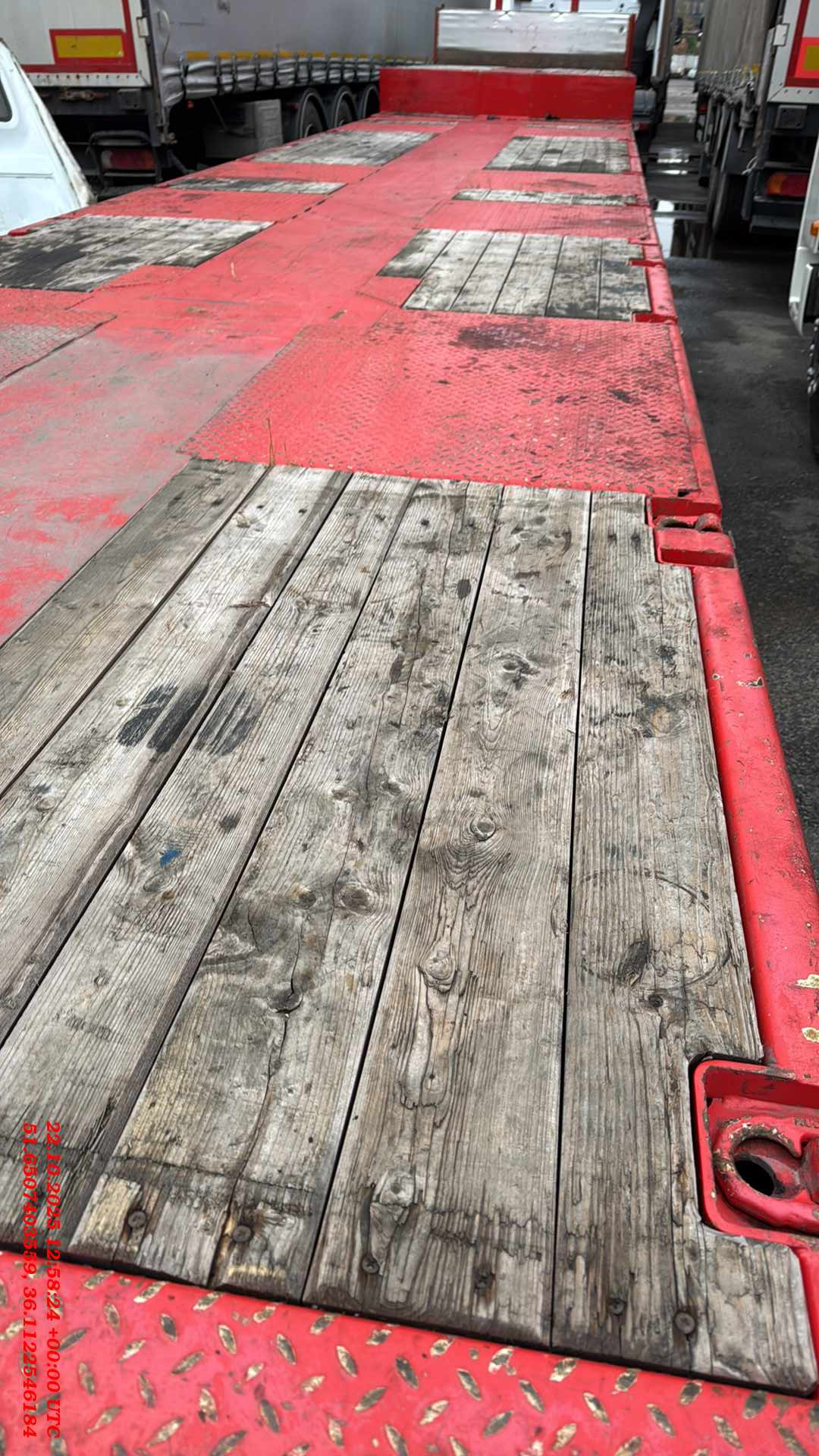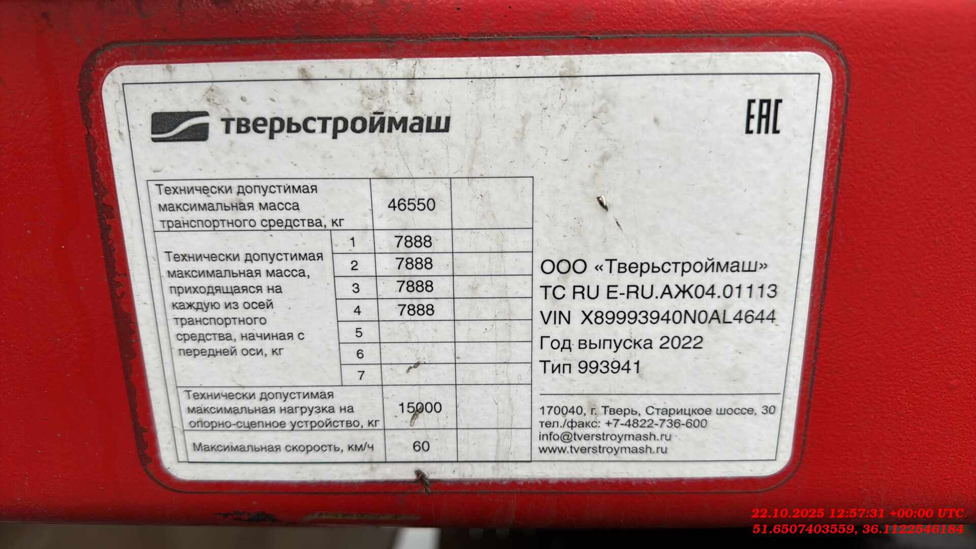 Наименование параметра ТС 1. Марка Тверьстроймаш 2. Модель 993941 3. Исполнение LE35W 4. Серия Original 5. Грузоподъемность технически допустимая, кг 35000 6. Нагрузка на ССУ тягача, кг 15000 7. Шасси 7.1 Высота расположения опорного листа полуприцепа при технически допустимой максимальной нагрузке, мм 1100 +/- 40 7.2 Внутренний радиус передней части полуприцепа (не менее), мм 2100 7.3 Борта на гуське нет 7.4 Настил платформы гуська из древесины 7.5 Сцепной шкворень (основной), дюймы 2» 7.6 Место установки шкворня 2» на 2100 7.7 Опорное устройствомеханическое 7.8 Тип гуська прямой 7.9 Высота погрузки при технически допустимой максимальной нагрузке, мм 895 +/- 15 7.10 Длина грузовой платформы (длина при полном раздвижении), мм 11400(19400) +/- 50 7.11 Ширина грузовой платформы, мм 2530 +/- 10 7.12 Длина свеса грузовой платформы, мм – 7.13 Настил грузовой платформы из древесины 8. Ходовая часть 8.1 Подвеска пневматическая, Европейский бренд 8.2 Оси 4(3+1), (1 - стационарная с механизмом подъема, 2 и 3 - стационарные, 4 - подруливающая), Европейский бренд 8.3 Расстояние между осями, мм 3510, 1360, 2510, +/- 10 8.4 Тормозной механизм осей барабанный 8.5 Количество колес, шт. 12 8.6 Шины 235/75 R17.5 9. Тормозная система 9.1 Стояночный тормоз пружинные энергоаккумуляторы 9.2 Система тормозная пневматическая с функцией АБС 9.3 Тип разъемных соединений тормозной системы с тягачем ГОСТ 33603 /ISO 1728/ ISO 7638 10. Электрооборудование 10.1 Напряжение, В 24 10.2 Тип разъемных соединений электрооборудования с тягачем ГОСТ 9200-76/ ISO 1185-N, ISO 3731-S 11. Цвет 11.1 Цвет ТС (RAL) Красный (RAL 3020)