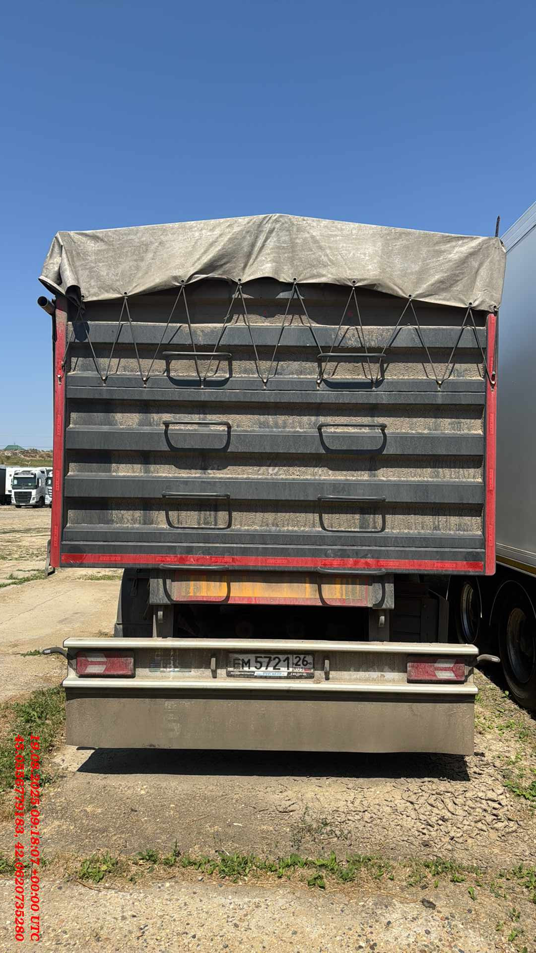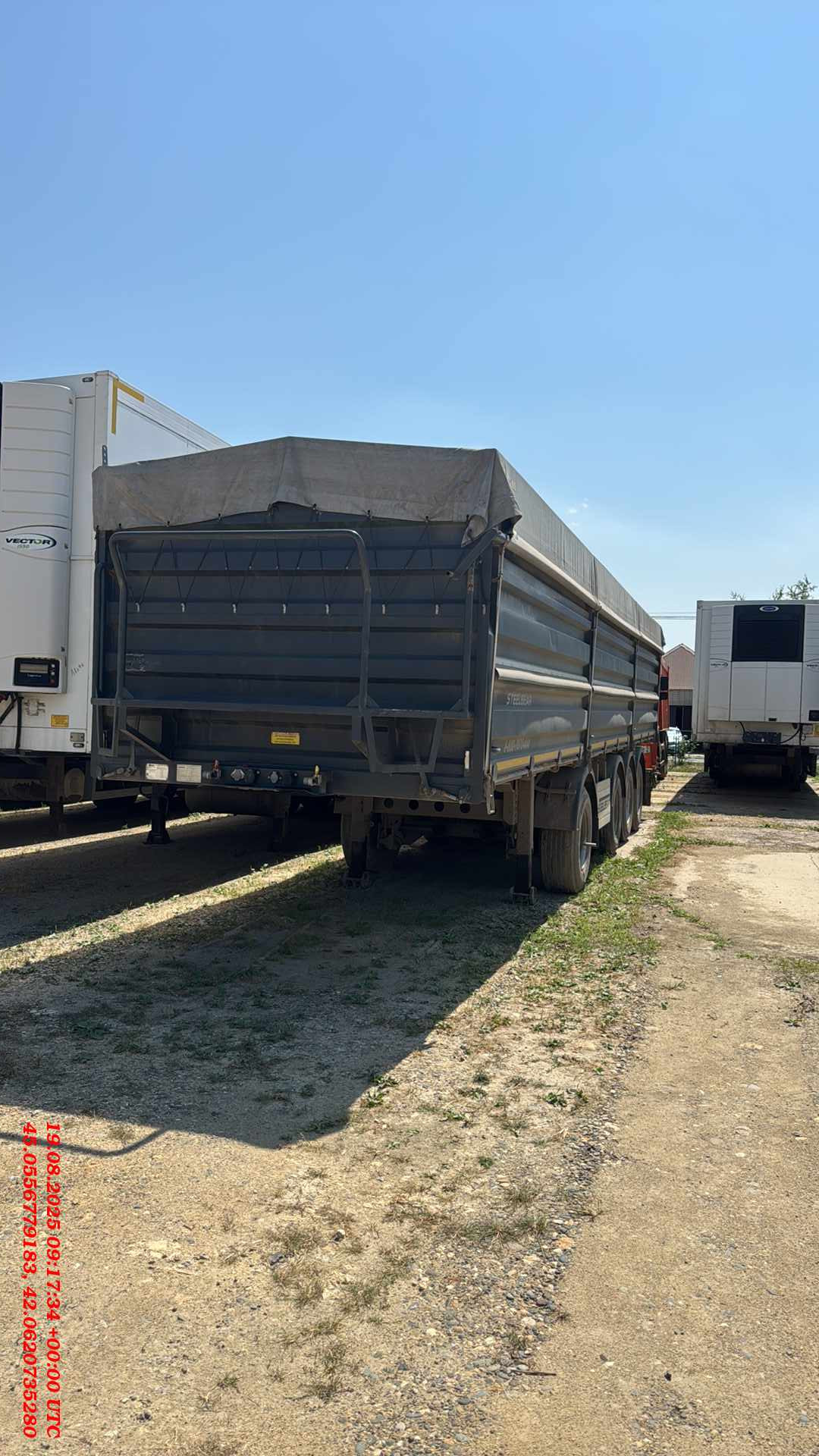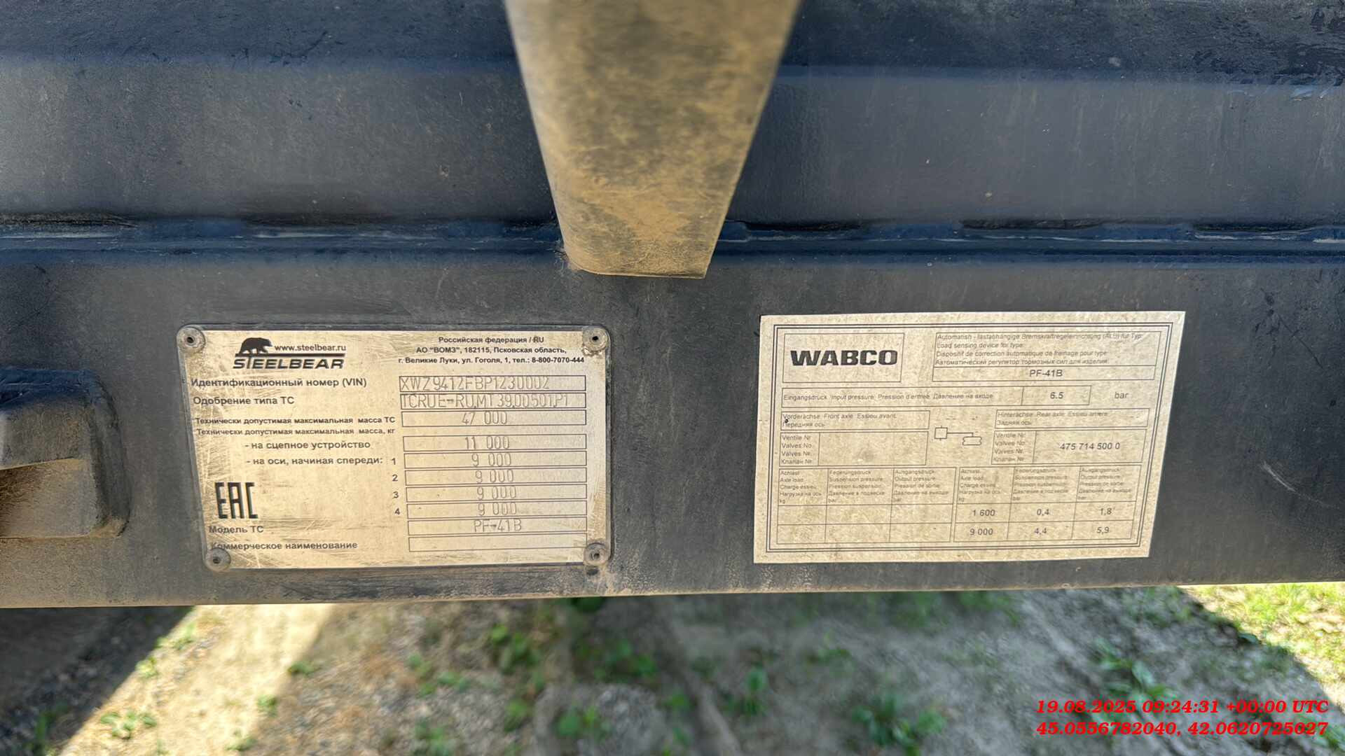 Полуприцеп Зерновоз Steelbear PF-41B Технически допустимая максимальная масса транспортного средства, кг - 47 000 Внутренние размеры Длина, м - 12,640 Ширина, м - 2,48 Высота, м - 1,90 Тент, шт - 1 Сматывающее устройство, шт - 2 Трап для обслуживания тента с двумя лестницами и поручнями Откидные борта с двух сторон, на верхней навеске, открываются отдельно, оборудованы резиновым уплотнителем, шт- 12 (6*2) Задний борт – распашные ворота с шиберами, оборудованы резиновым уплотнителем, шт - 2 Шасси: 4-осное Пневматическая подвеска Колёса: Ошиновка односкатная Диски: 11,75 х 22,5 Количество колёс: 8, 385*65*22,5 Электросистема: 24В Тормозная система: Тормозная система – дисковая ABS Пневмосистема: Подвеска интегрального типа, пневмоподвеска с ручным краном подъёма опускания