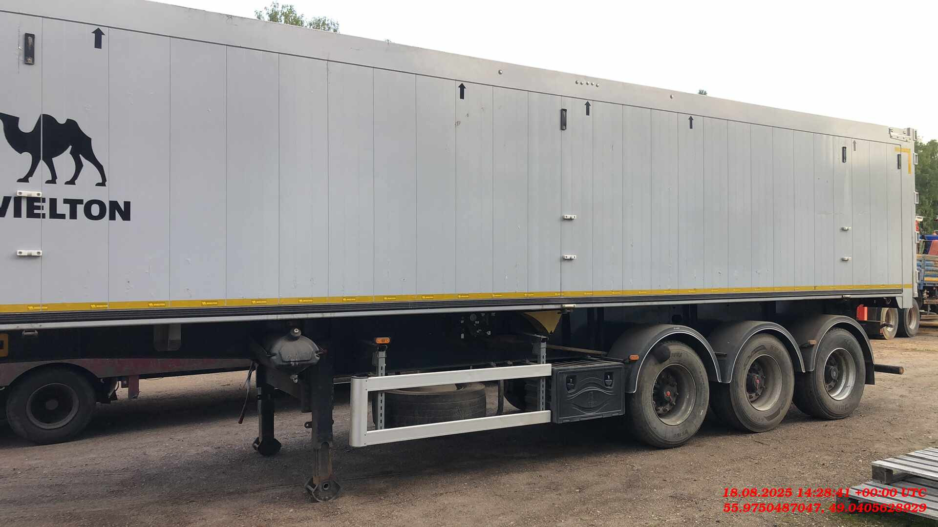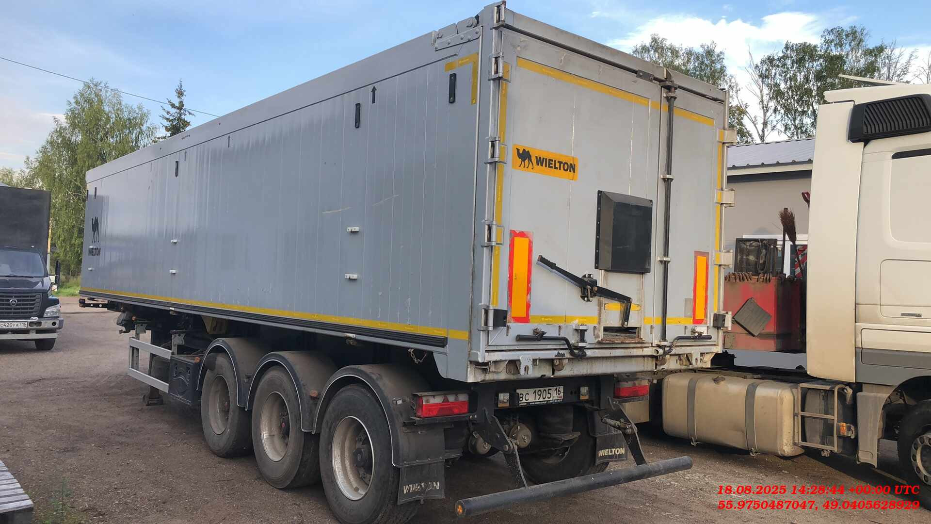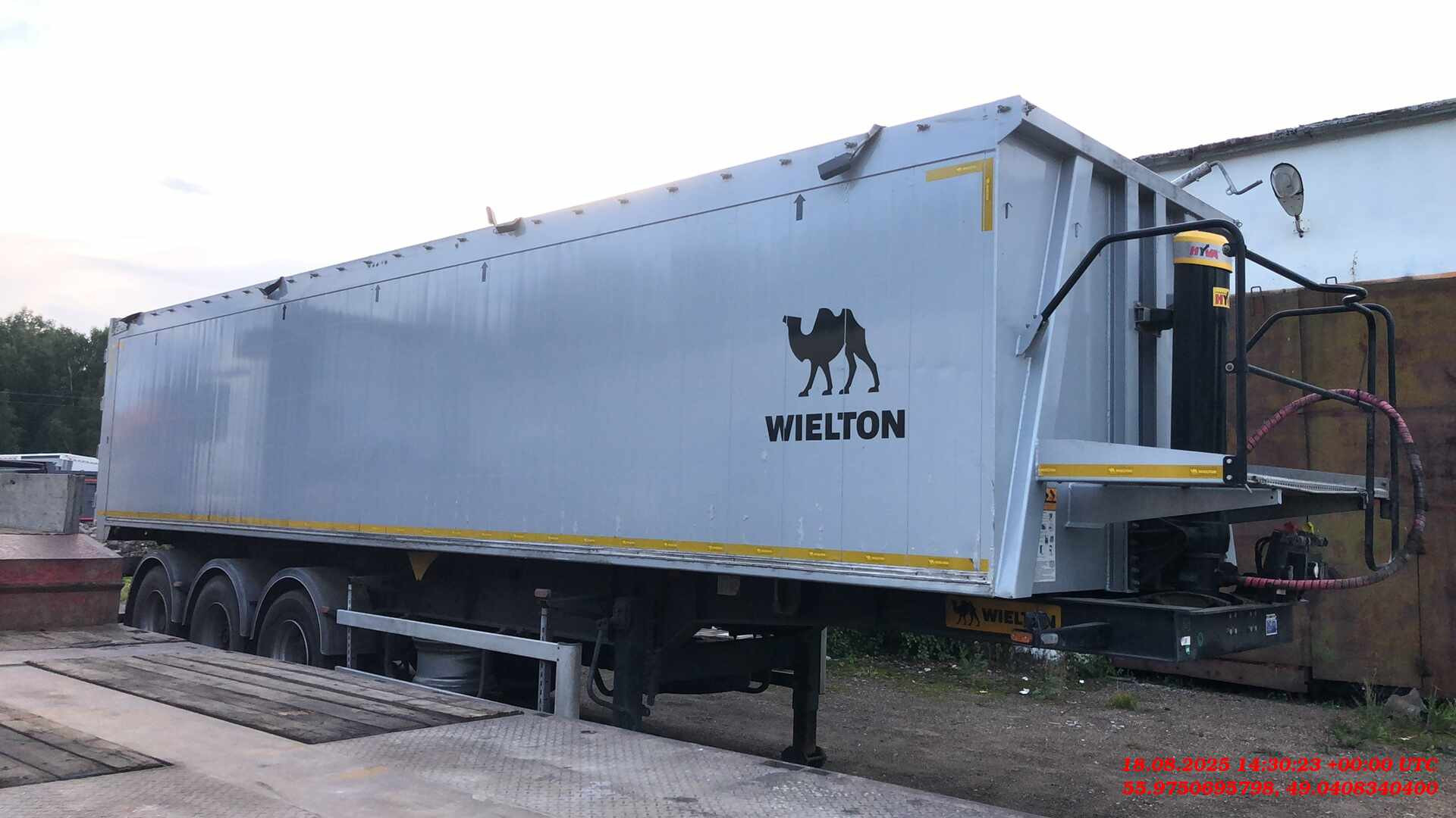 Ответственный за реализацию: Михеев Максим Номер лота: 000014152 Полная масса 42 000 кг, вес 7000 кг рама ▪ стальная конструкция шасси ▪3-осное дисковое SAF, техническая нагрузка оси до 9000 кг, ▪ пневмоподвеска, клапан H-S ▪ подъёмная первая ось, ▪ плита сцепки с 2-дюймовым королевским шкворнем, ▪ двухдиапазонные опорные ноги, ▪ боковые противонаездные предохранители в соответстии с ECE, ▪ задний буфер в соответствии с ECE тормозная система ▪ соответствует ECE, wabco ▪ автоматическая регулировка тормозов, ▪ антиблокировочная система ABS/EBS в соответствии с ADR грузовой отсек ▪ кузов выполнен из листового алюминия и профилей, ▪ лого WIELTON на боковых стенках, ▪ лестничная площадка на раме ▪ задний затвор – клапан-двери с ссыпным лючком ▪ гидроцилиндр без возвратного клапана HYVA, ▪ тент, сворачивающийся на бок ▪ тент фиксируется ремнями с устройством натяжки Cтяжная балка Автоматический спуск подушек электрическое оборудование ▪ 24 v согласно с нормами ECE i ADR, ▪ задние огни в комплекте с сигналом заднего хода, противотуманной фарой, указателями поворота и треугольниками отражателя света ▪ освещение номерного знака, ▪ габаритные огни, ▪ боковое освещение, ▪ щиты отражателей света, ▪ 2 подключительные розетки и розетки ABS/EBS на передней стенке без соединительных проводов лакировка ▪ все стальные элементы перед лакировкой дважды поддаются дробеструйной обработке, ▪ лакировка производится в лакировочных камерах ▪ рама в серый цвет RAL 7021